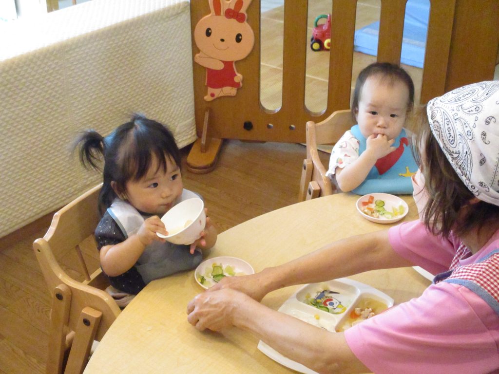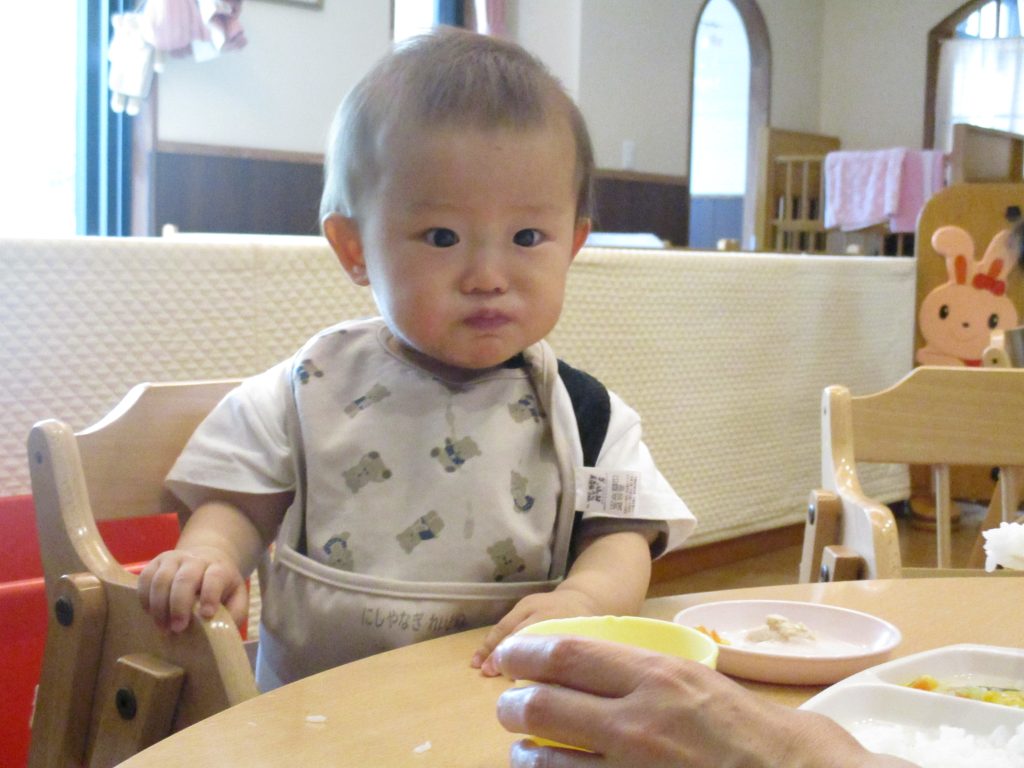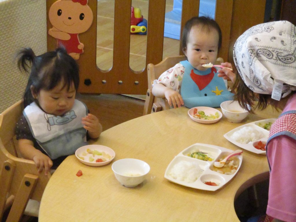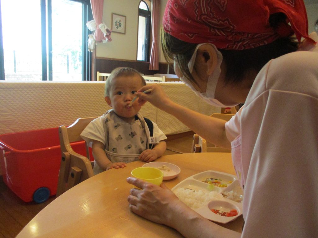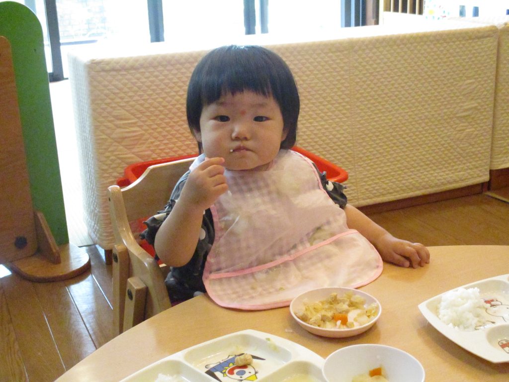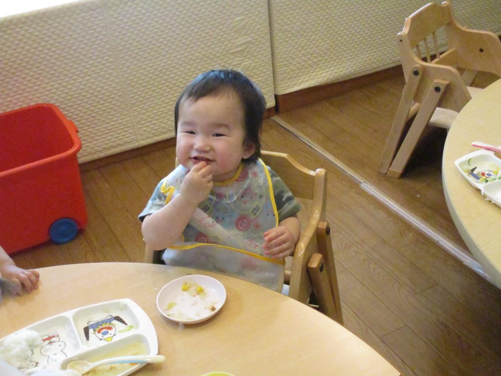 おいしいきゅうしょくいただきま~す(ちゅうりっぷ組) 2022/06/16 給食の時間が待ち遠しい子どもたち おいしそうにパクパクと食べています 手でつまんで口に入れてモグモグと食欲旺盛です 「たくさんたべて、あついなつをのりきるぞ!!」 「上手に食べれたね~」の声に自分で頭をなでなで😊 なんとも愛らしい場面でした