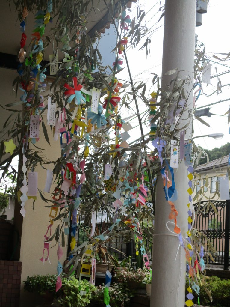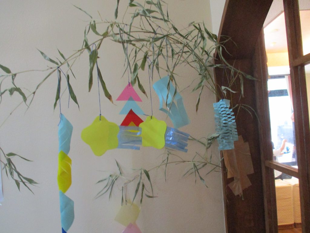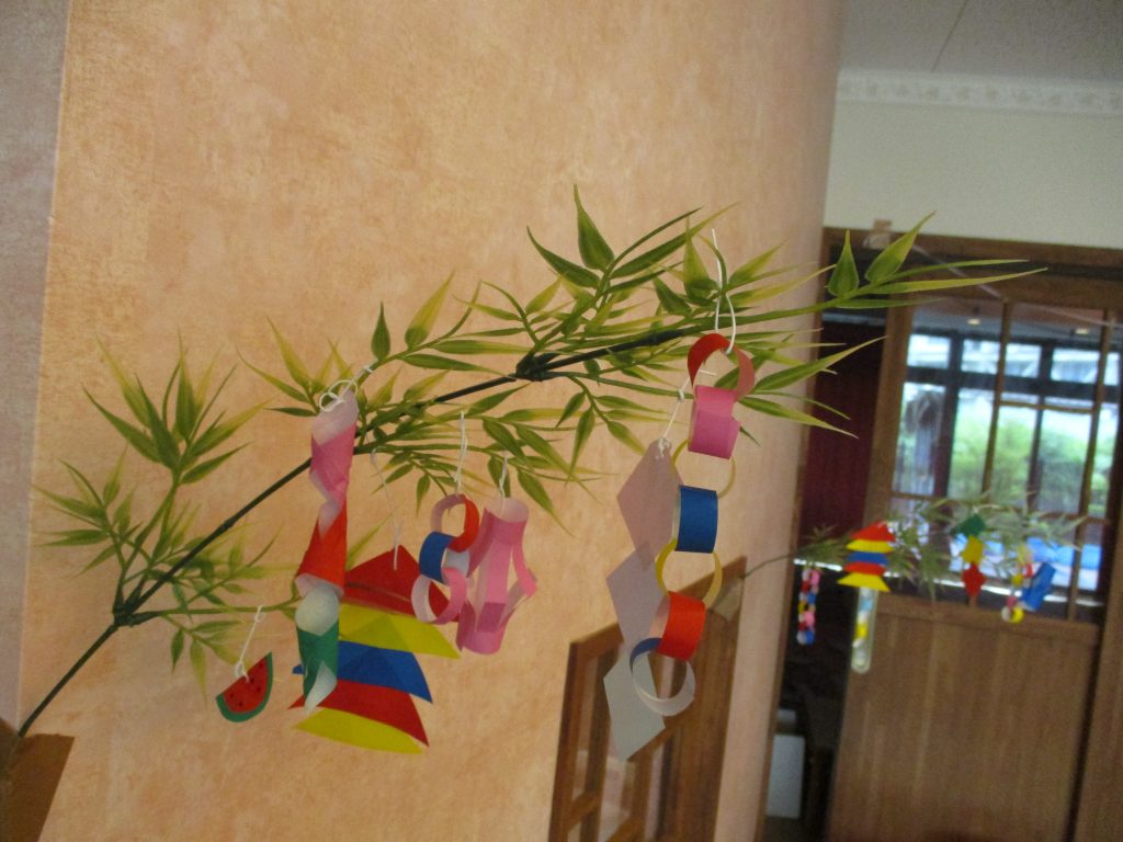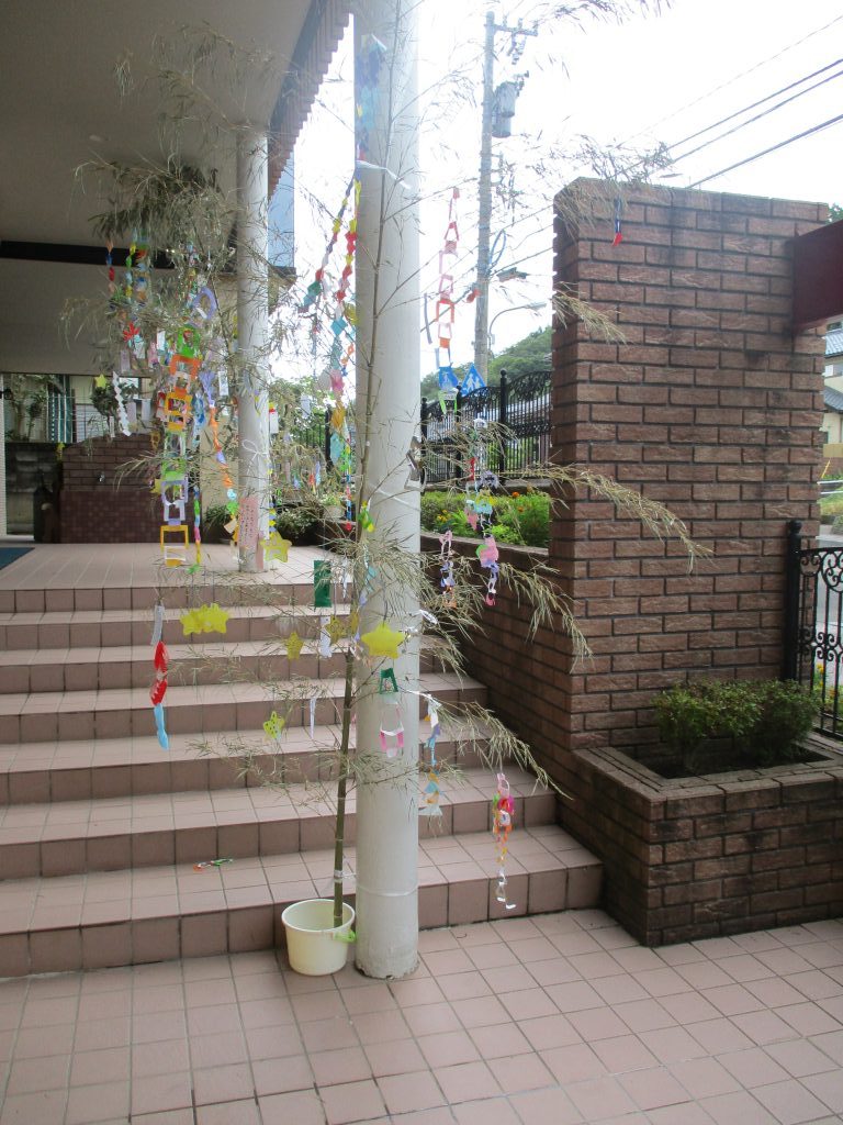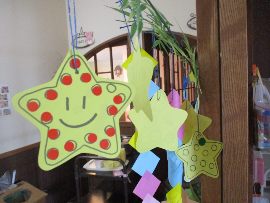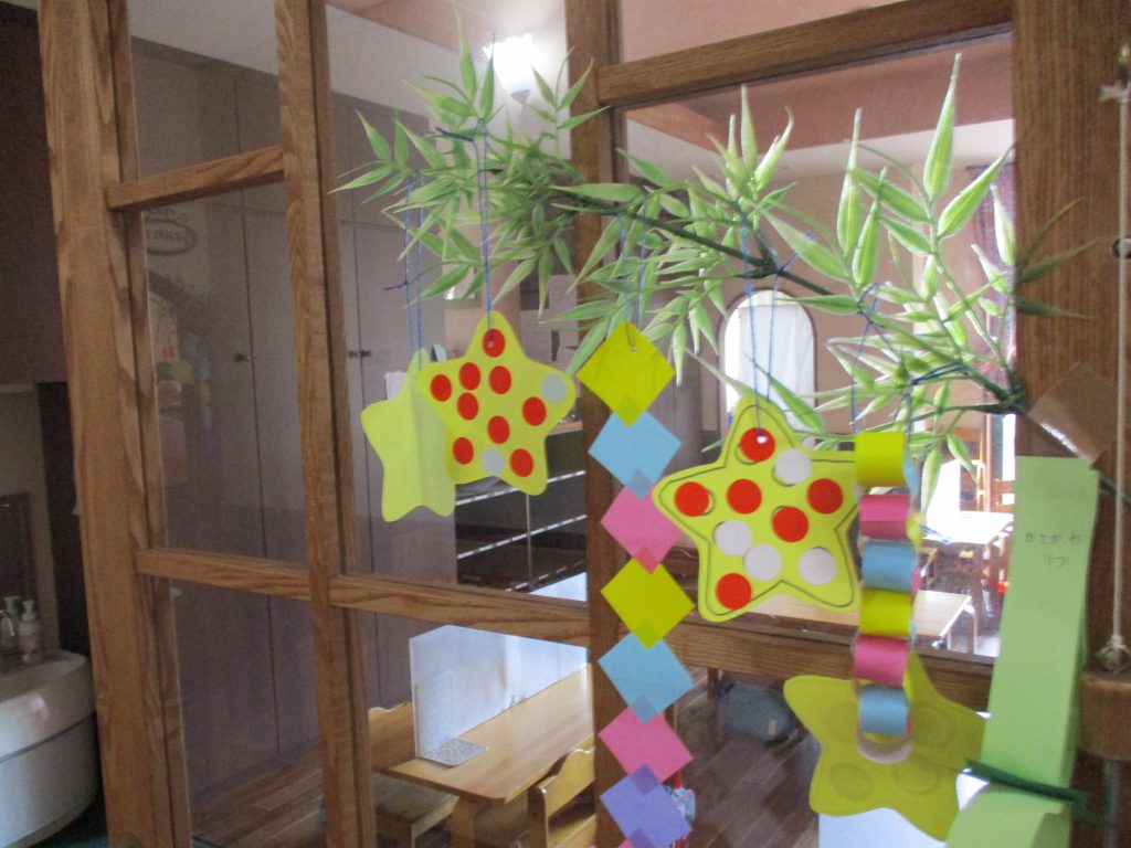 もうすぐ七夕 2022/07/04 7月7日の七夕の日が近くなりました こども園の玄関や保育室の中は笹飾りが付いた笹の木が飾られていて、蒸し暑さが少し和らいでいます 短冊に込めたの願い事がかないますように★