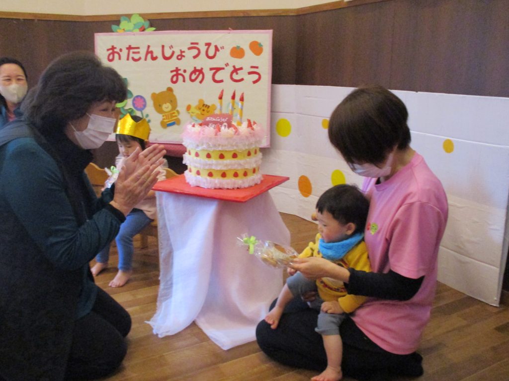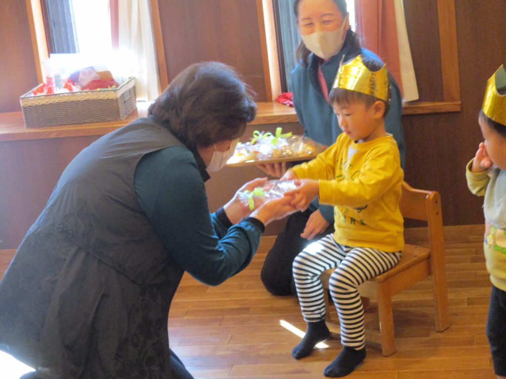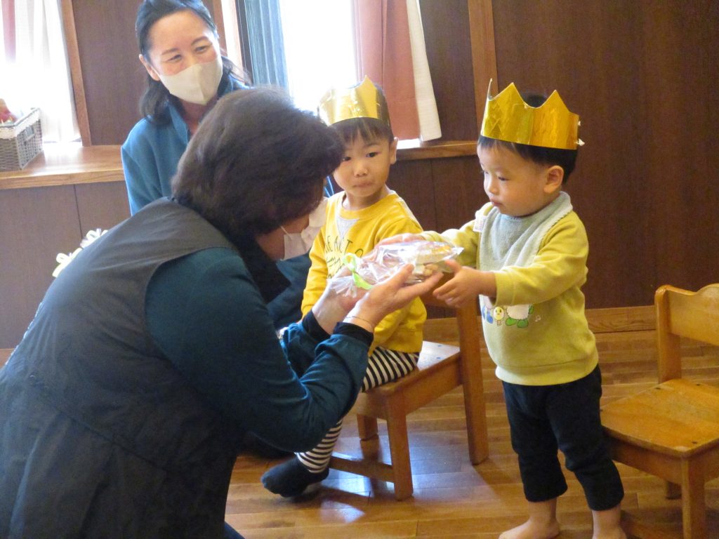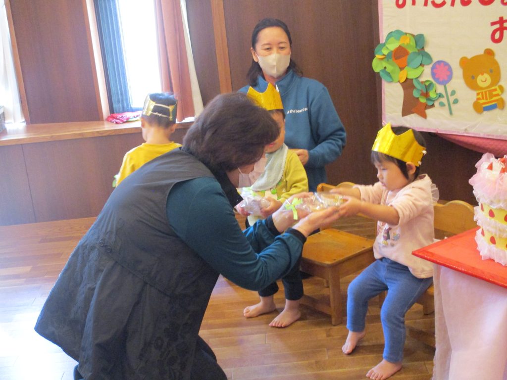 冠👑をつけてもらって名前を呼ばれて、ハイと返事をしたり、おめでとうの歌をプレゼントされて子どもたちは照れながらとても嬉しそうでした