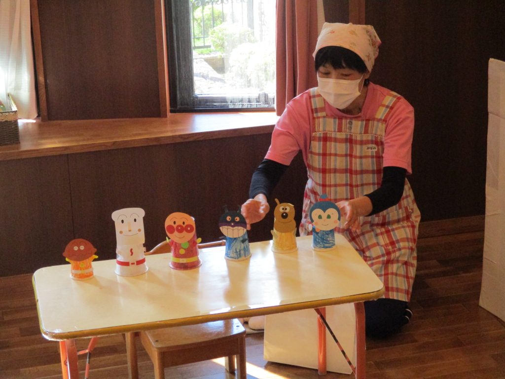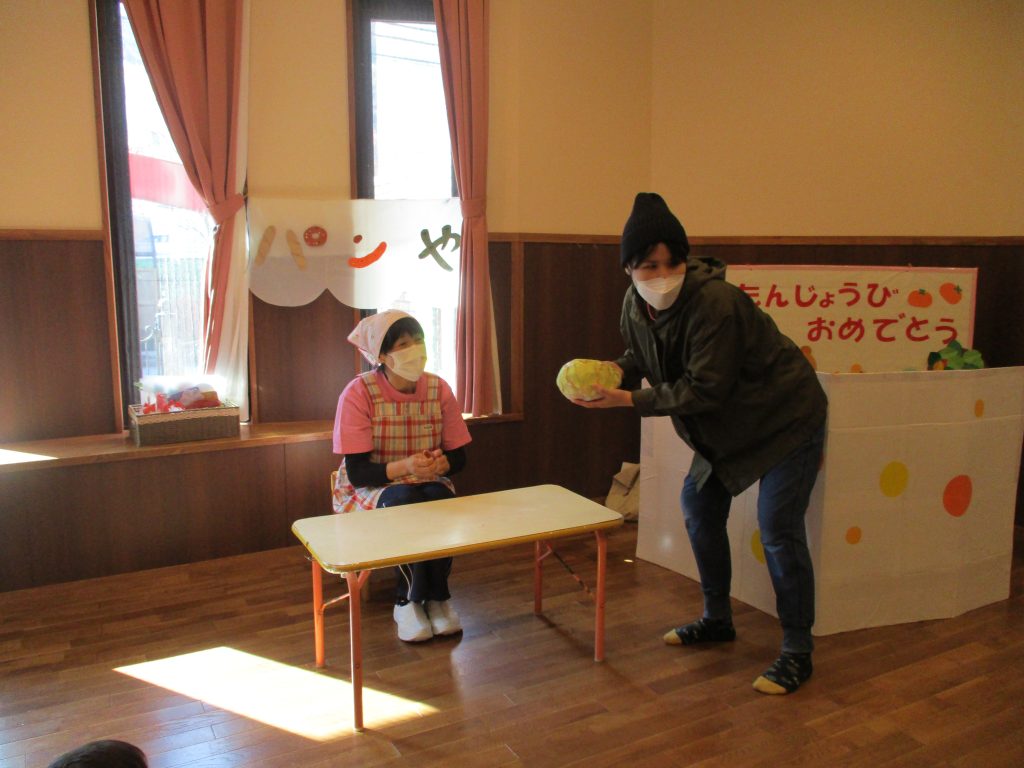 お楽しみは『5つのメロンパン:職員劇バージョン』で子どもたちはおいしそうなメロンパンや様々な衣装で出てくる先生方に注目!で、楽しい時間を過ごせました