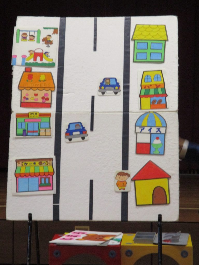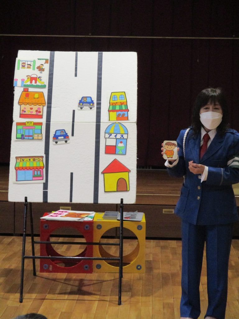 どうして交通ルールを守らないといけないなど、パネルを使って教えていただいたあと、園前の道路を使って実際に手を挙げて左右の確認をしてから道路を渡る練習をしました