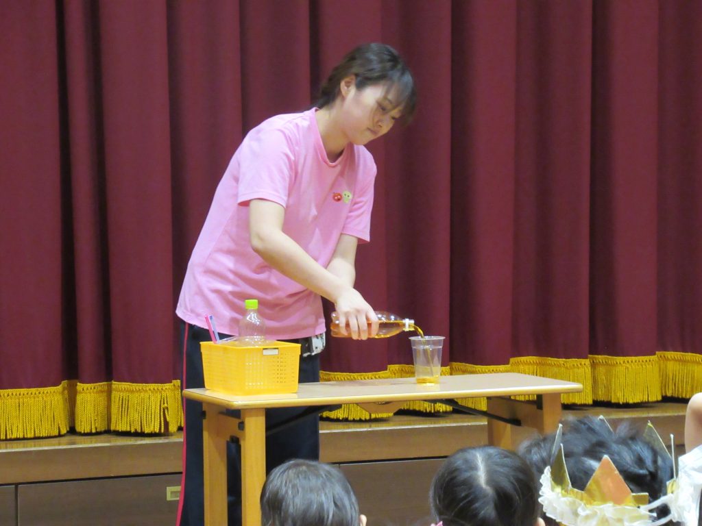 子どもたちが振ったボトルから様々な色が出てきて、マジックショーは大成功でした