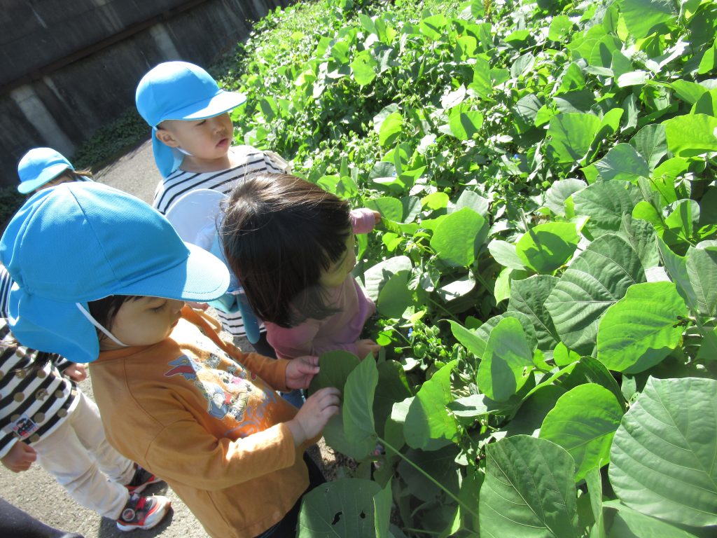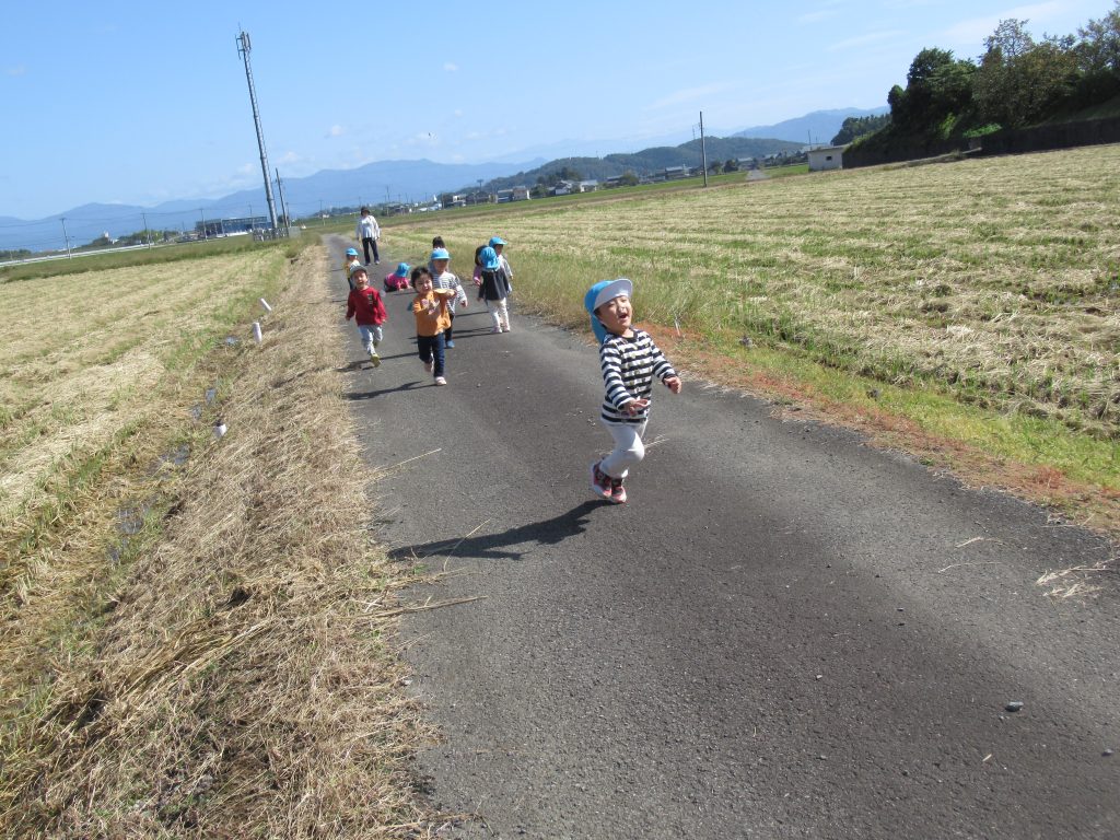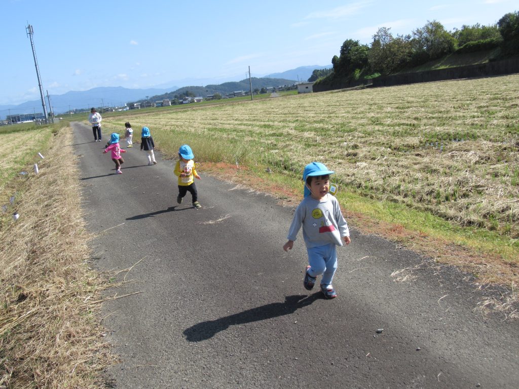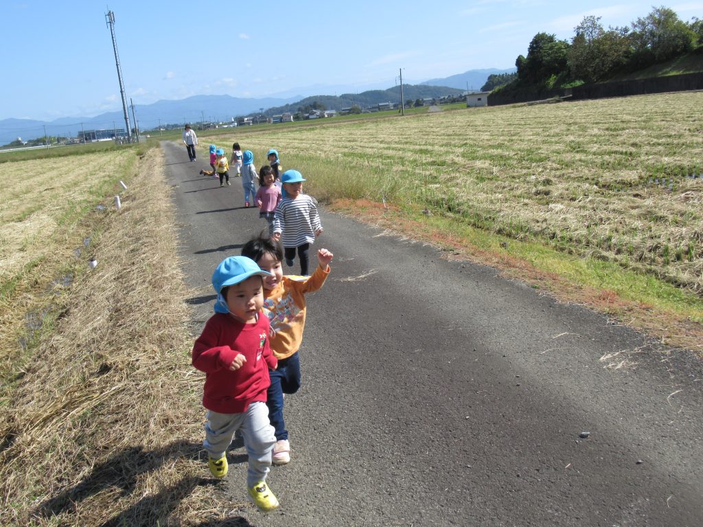 秋の探しの散歩に出かけたよ(たんぽぽ組) 2023/10/11 秋探しに出かけたたんぽぽ組のこどもたち 途中の畑にカボチャを見つけたり、秋の風をからだで感じたり、頭の上にバッタが飛んで来たりと暑い夏から秋へと移る変化を肌で感じた散歩となりました 「ただいま~~」とみんな元気よく帰ってきました