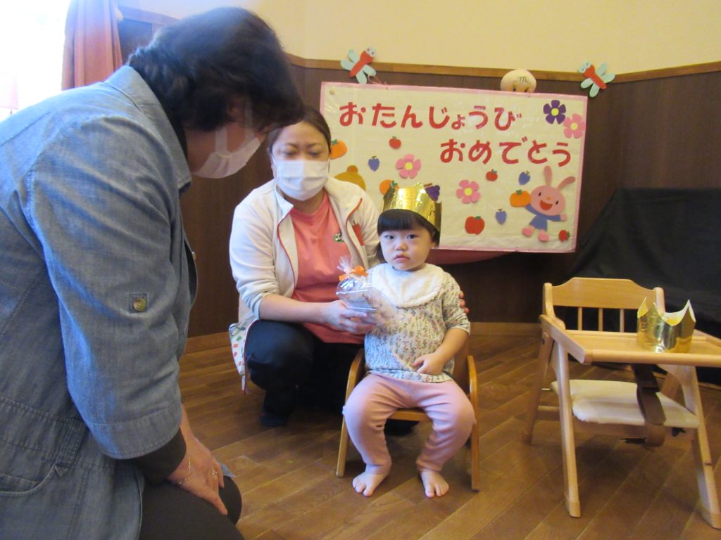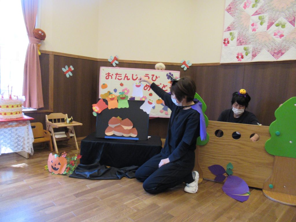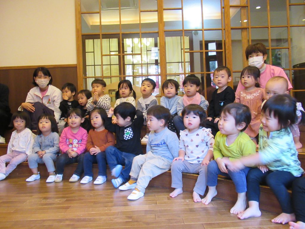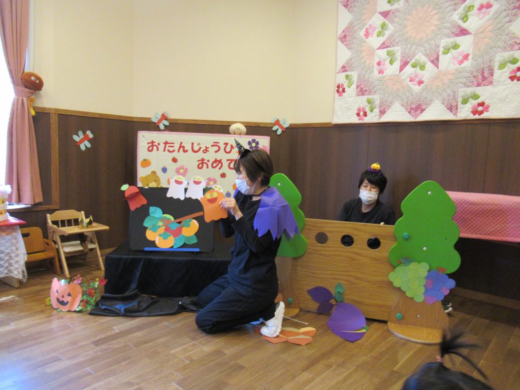 ハロウィン誕生会(未満児クラス) 2023/10/26 10月生まれの子どもたちの誕生会を開きました ハロウィン色いっぱいのふれあいホールでは、色が変身するお化けが出てきたり、秋の歌を歌ったり、秋の味覚がいっぱいの集まりを楽しみました 園長先生からプレゼントをいただきました 誕生日のみなさん、おめでとうございます