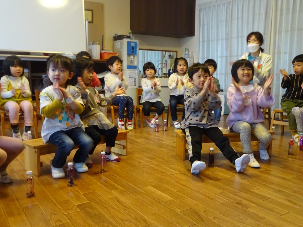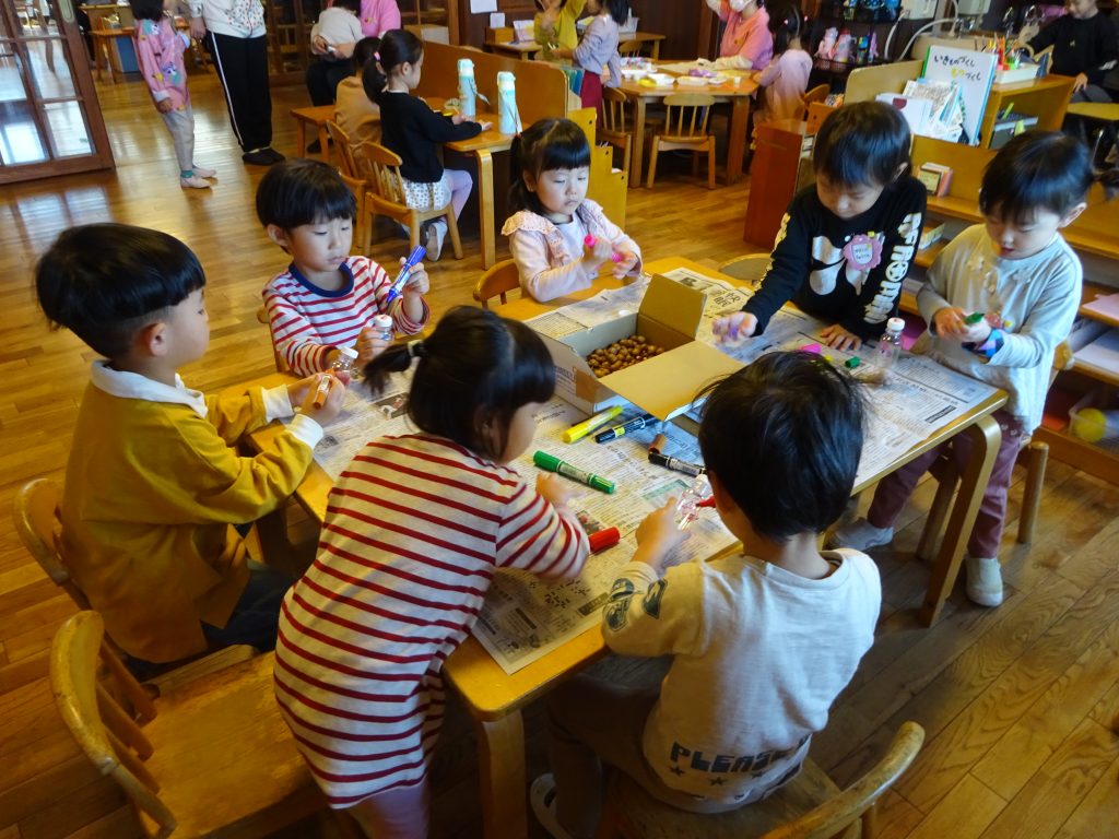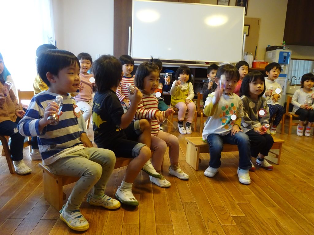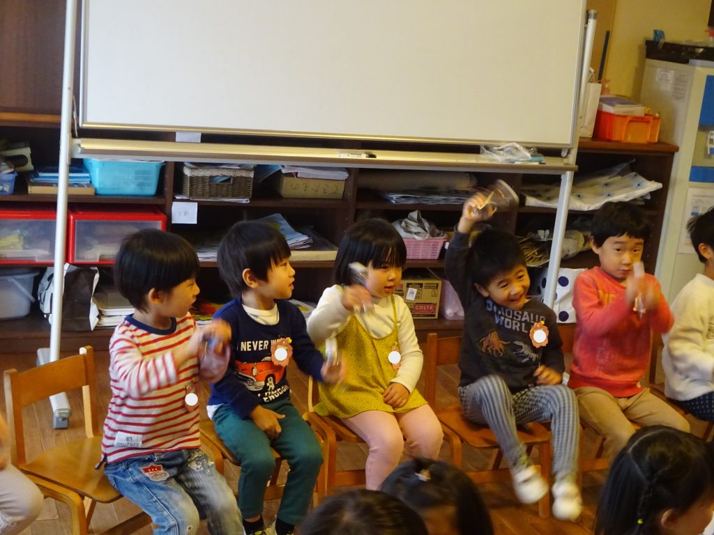 リズムあそび(さくら組) 2023/11/01 集まりで紹介したドングリを使って、ミニボトルに詰めて楽器を作りました 色塗りをマジックで色つけしました 今日は、歌に合わせてみんなで鳴らして遊びましたよ♪