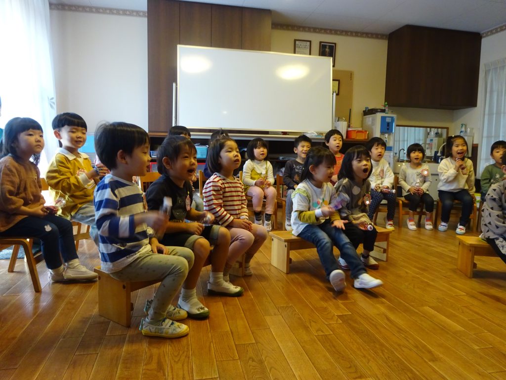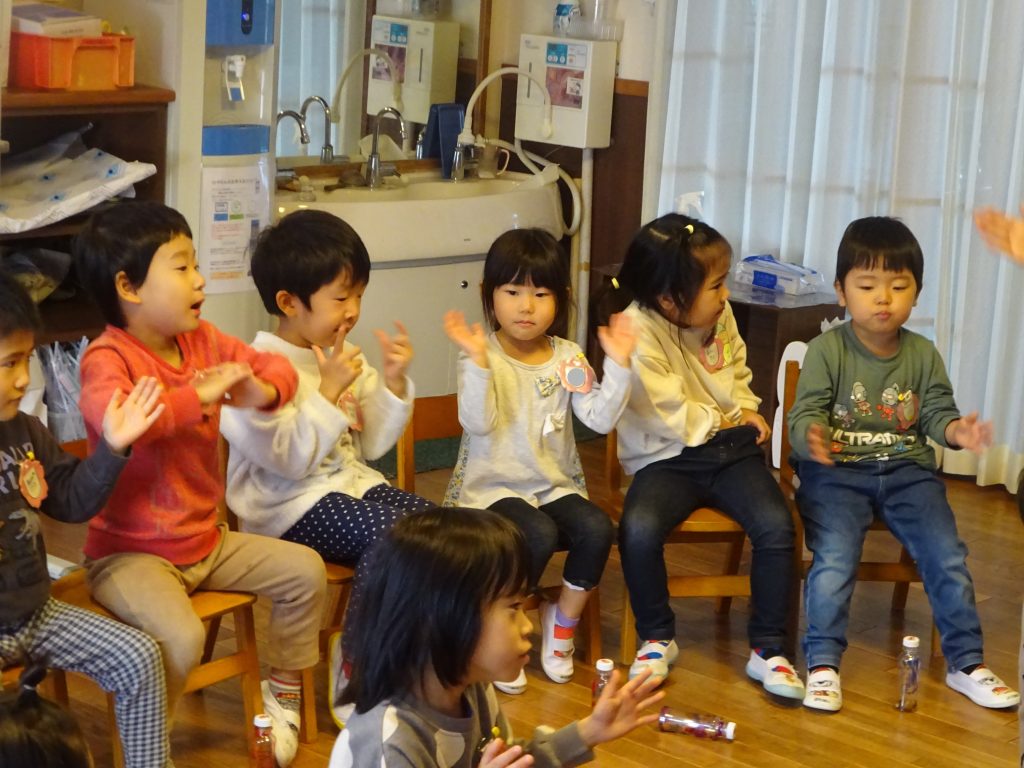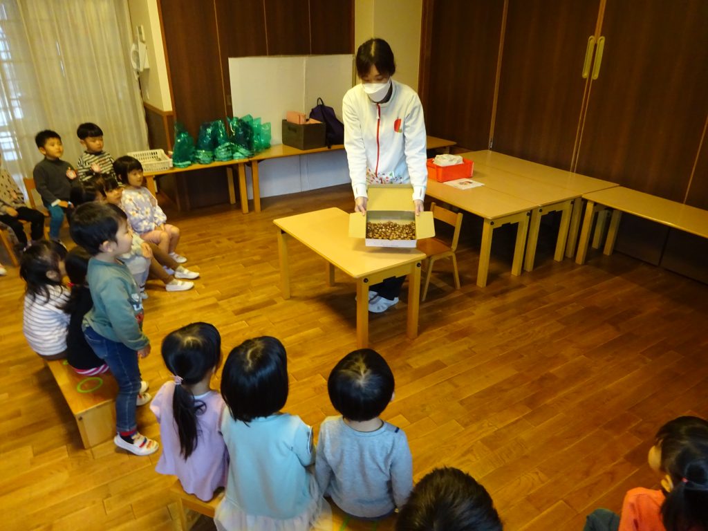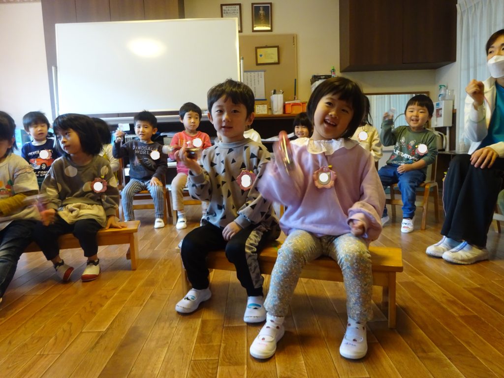 リズムあそび(さくら組) 2023/11/01 集まりで紹介したドングリを使って、ミニボトルに詰めて楽器を作りました 色塗りをマジックで色つけしました 今日は、歌に合わせてみんなで鳴らして遊びましたよ♪