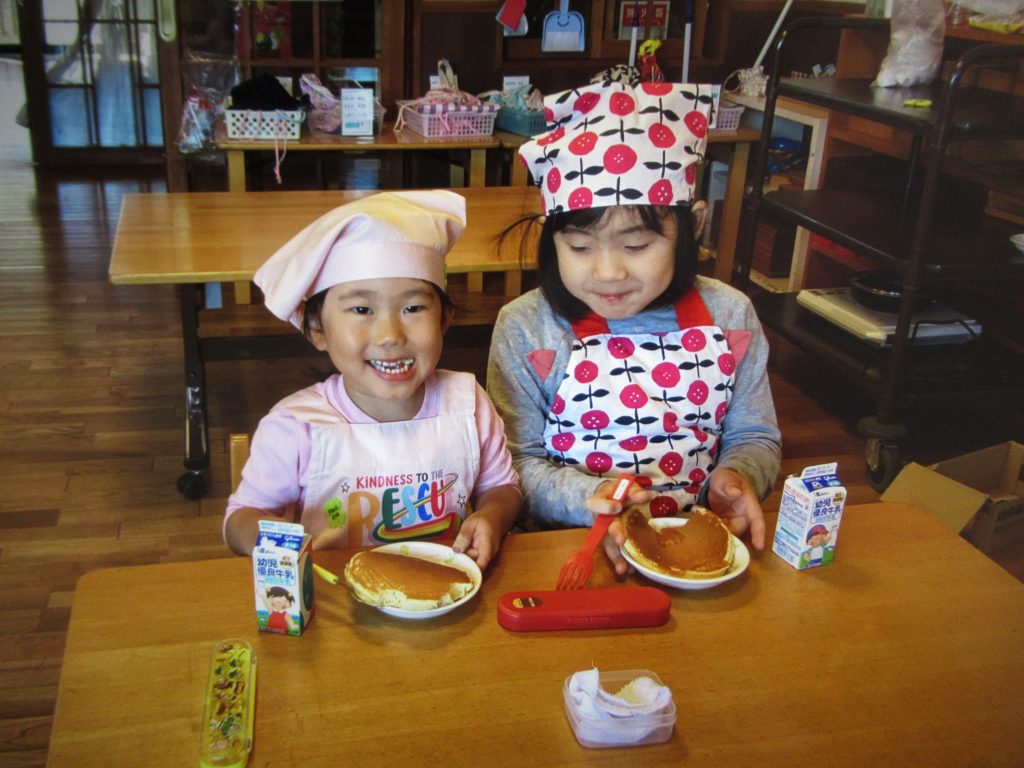 助け合いながら作ったホットケーキの味は最高でした♪