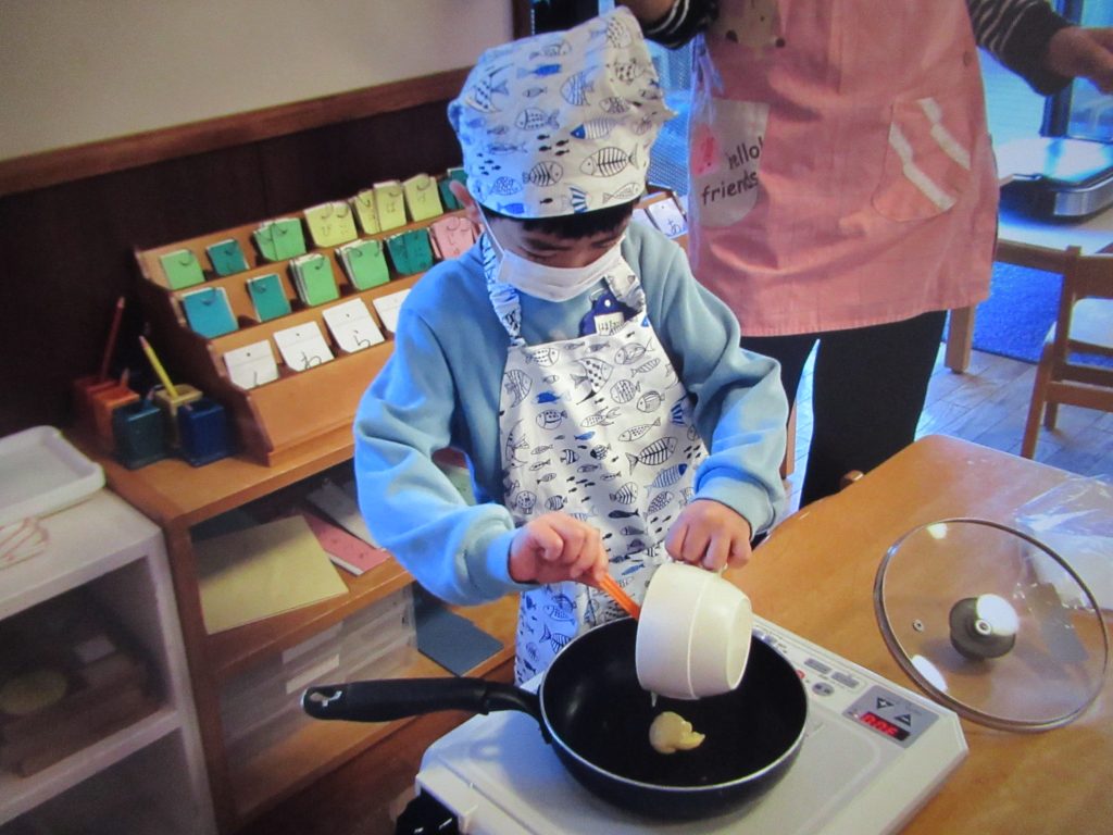 大さじをもちそーっと粉をはかったり、卵液がこぼれないように入れたり…