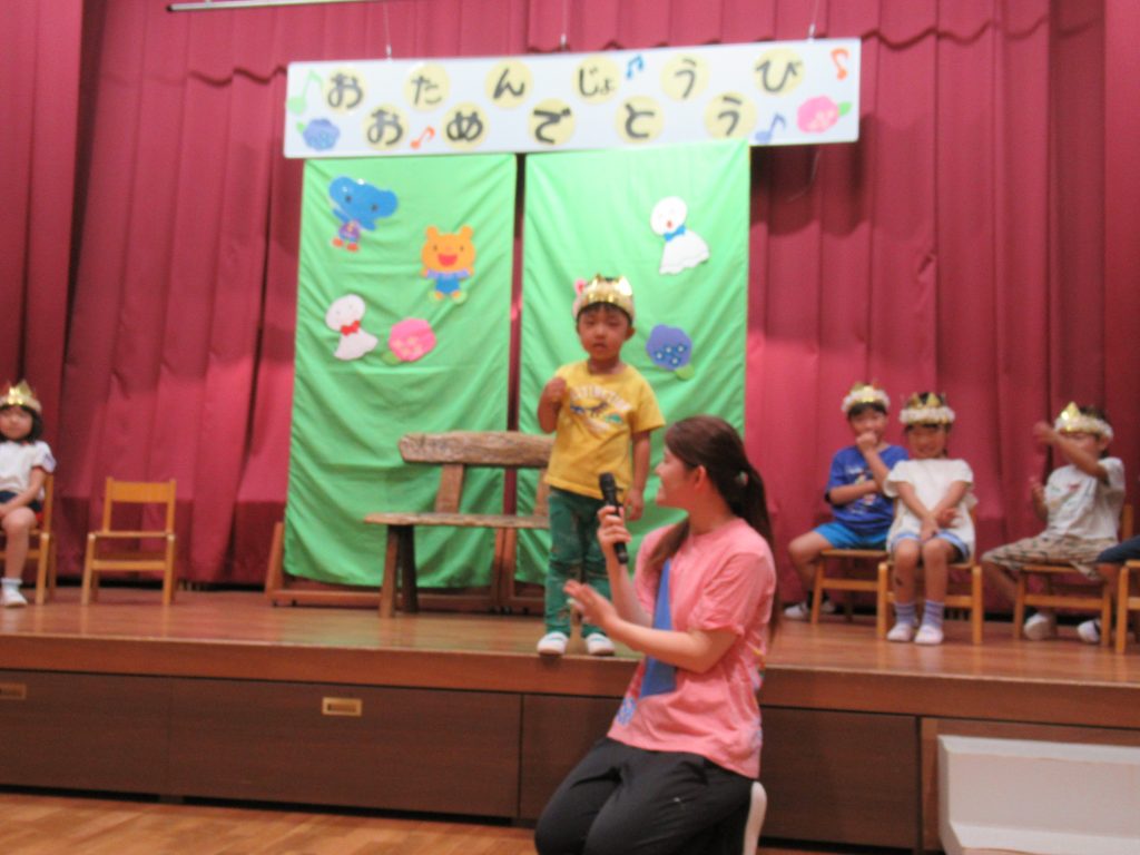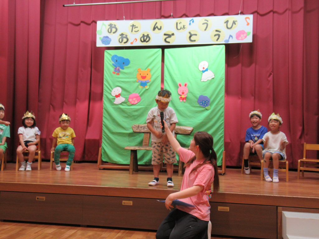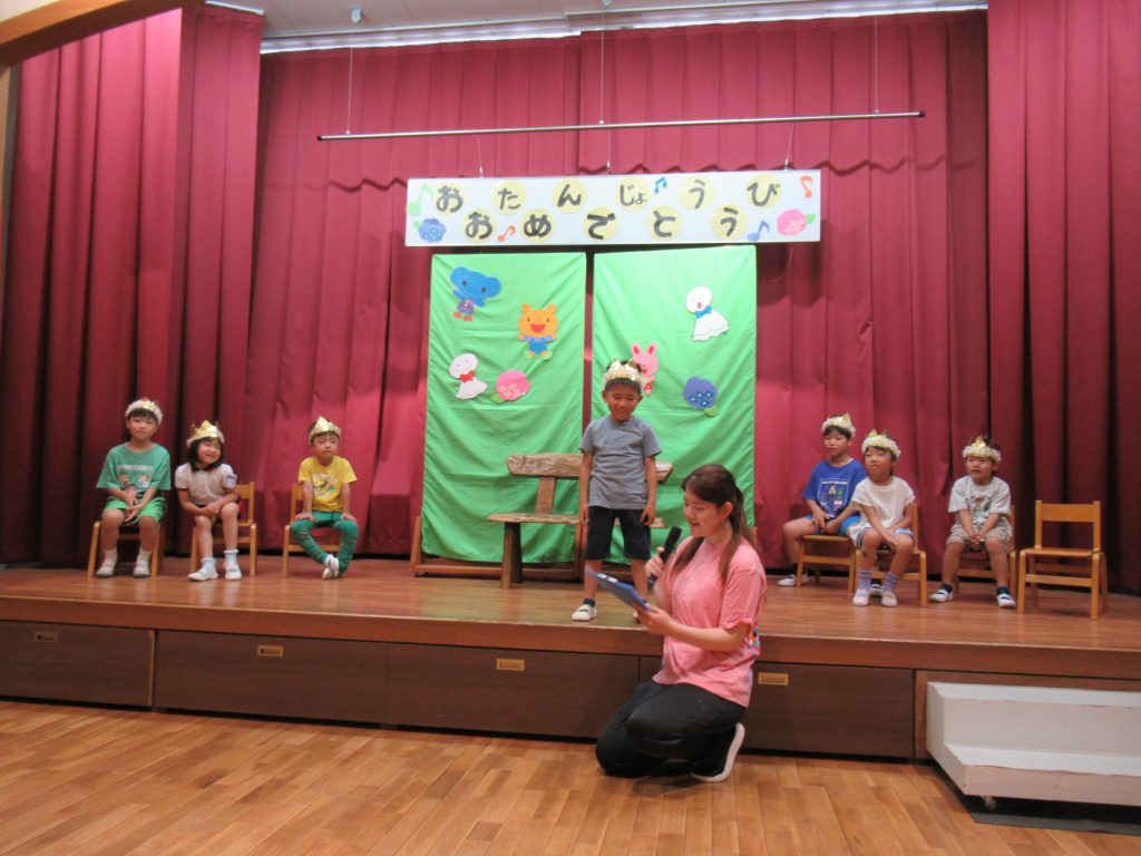 あじさい誕生会(たてわりクラス) 2024/06/13 6月生まれの誕生会を開きました 本日は4名のふじ組のおうちの方をお招きして開きました お祝いの歌や拍手をたくさんもらえて、こどもたちはニコニコでしたよ お楽しみは、『虫歯予防デー』にちなんで歯磨きの大切さや、甘いものの食べかすなどが虫歯になりやすい話がありました