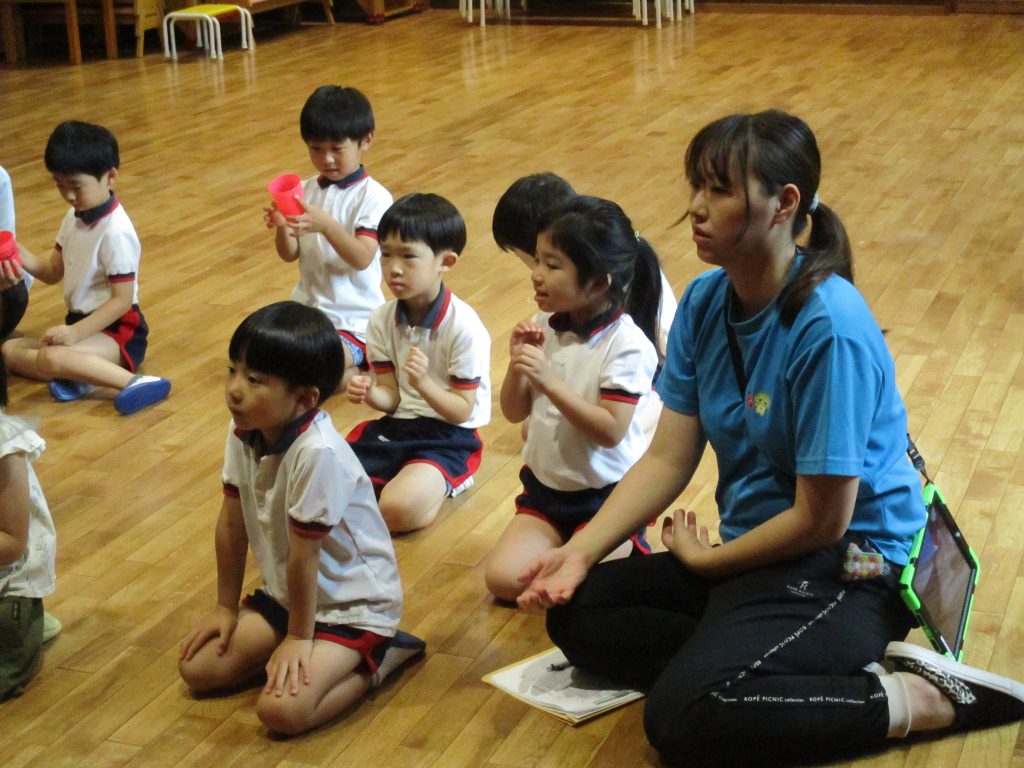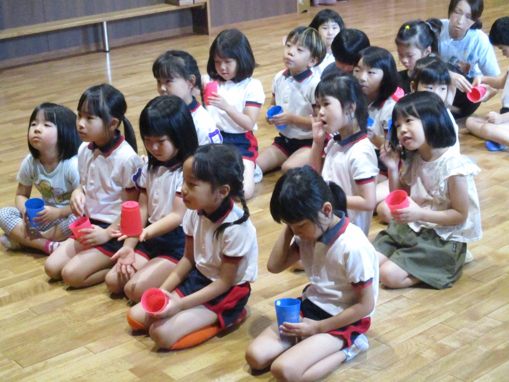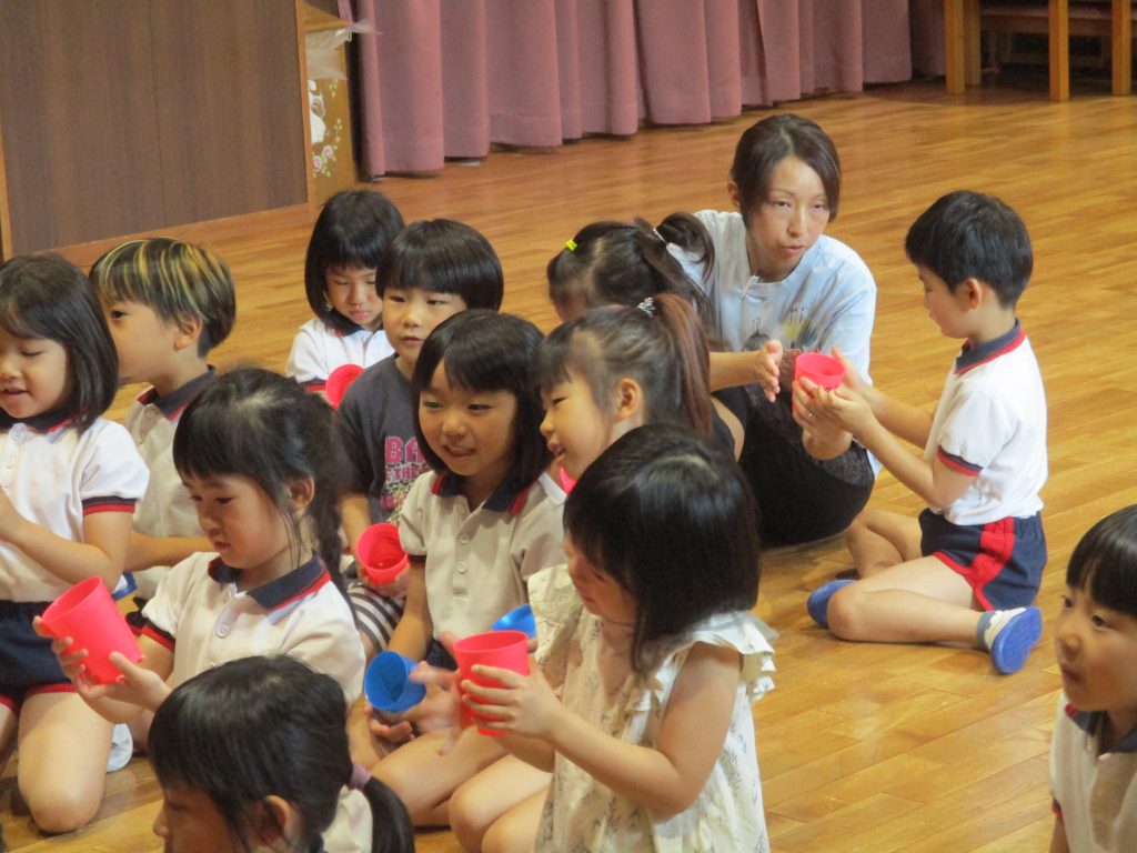 英語教室(ふじ組) 2024/07/17 ジョン先生の楽しい英語教室 カップに『IN』『OUT』『UNDER』など、カップの上や下やなかに手をおくことをゲーム感覚で英語を耳で聞けて話して自然に学べていましたよ