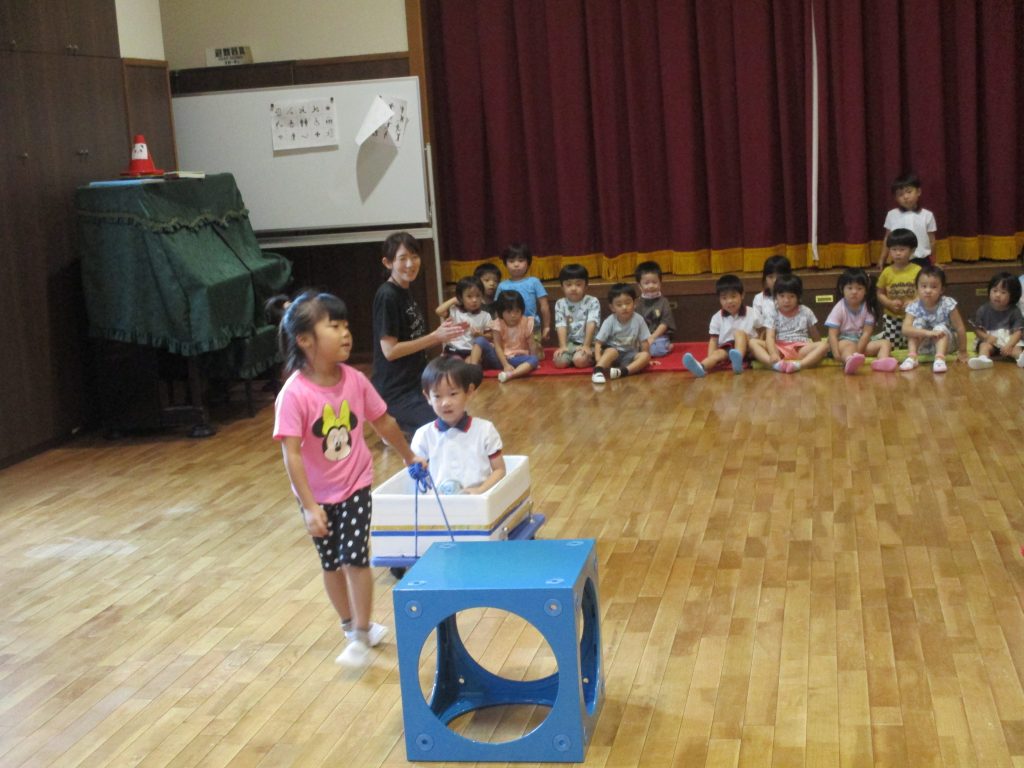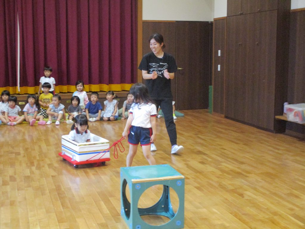 運動会あそび(さくら組) 2024/09/17 3歳児のさくら組のこどもたちと運動会あそびを楽しみました 名前を呼ばれてかけっこはゴールまで一生懸命走り切っていましたよ 新幹線のキャスターボードは、うめ組のお姉さんに引いてもらって進めていきました 優しく手を取ってくれてこどもたちは楽しみながら参加できました もうすぐ運動会ですね
