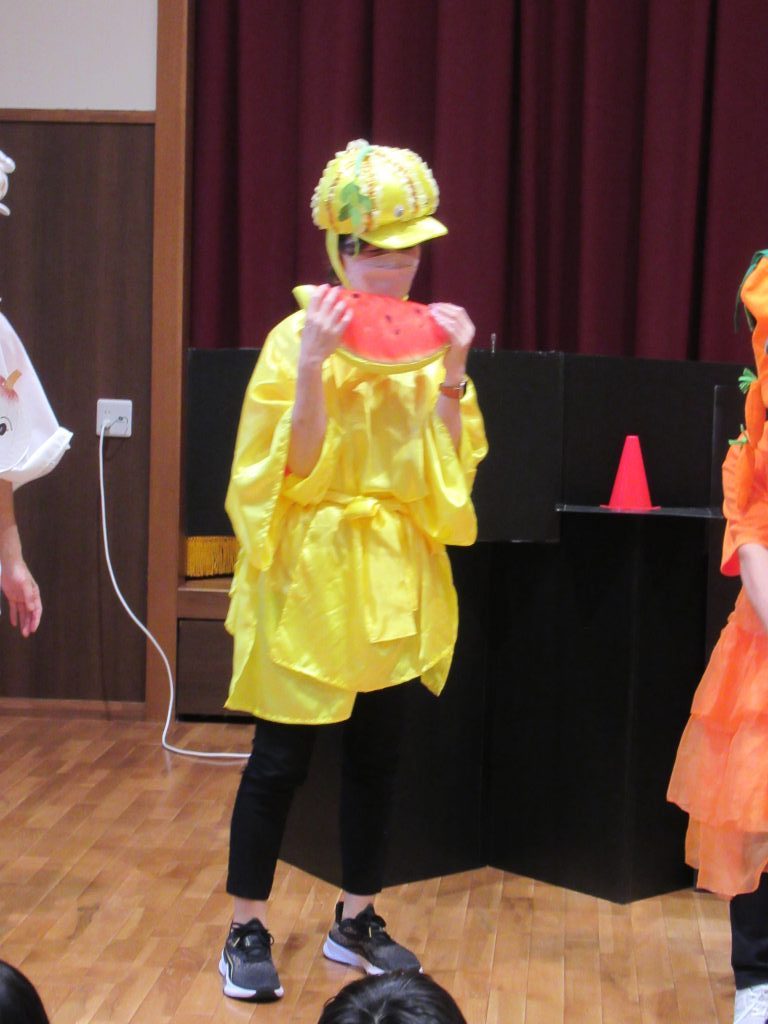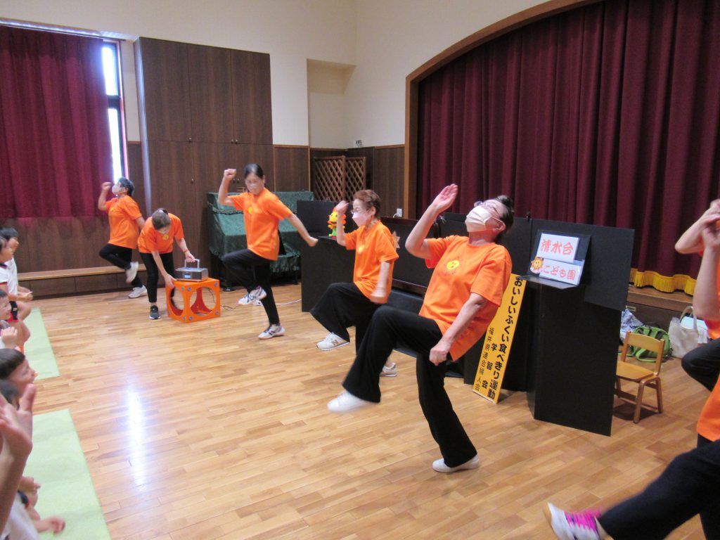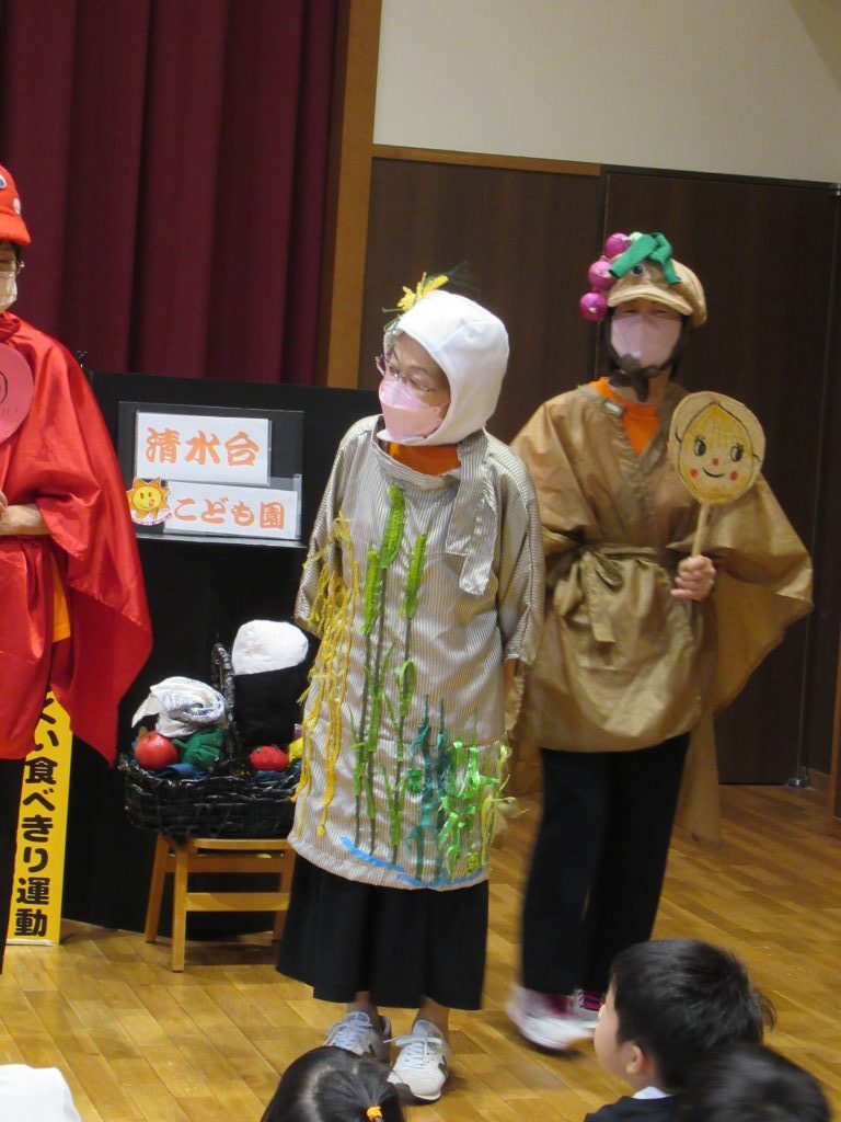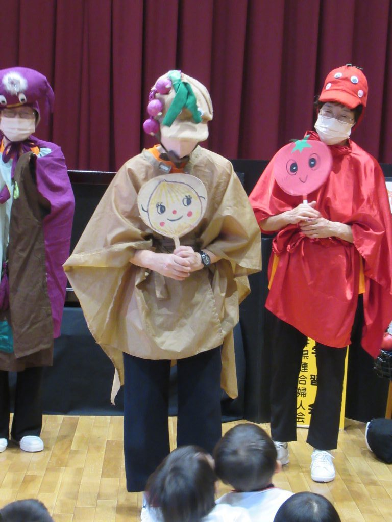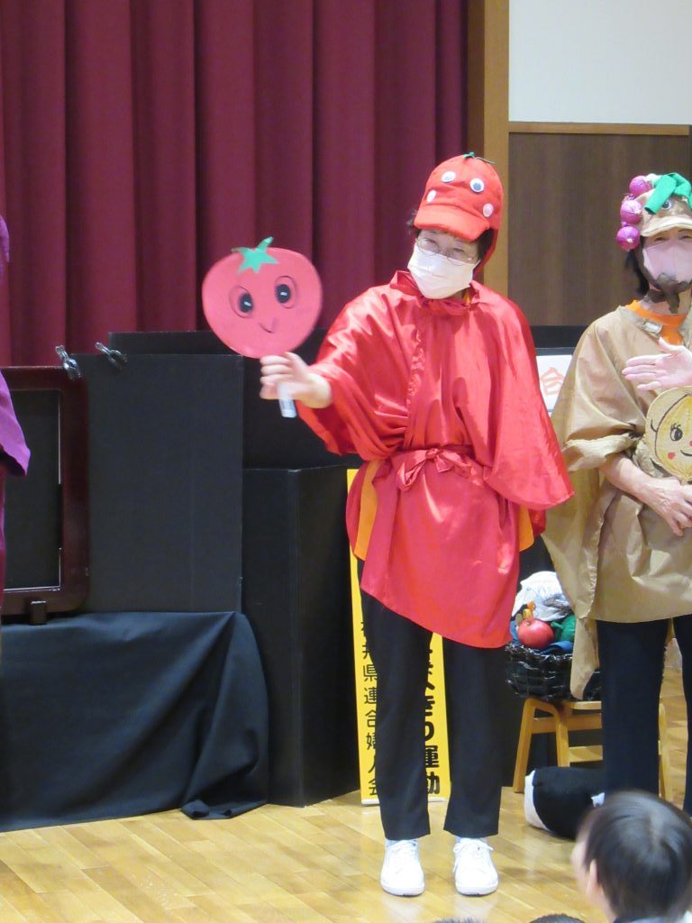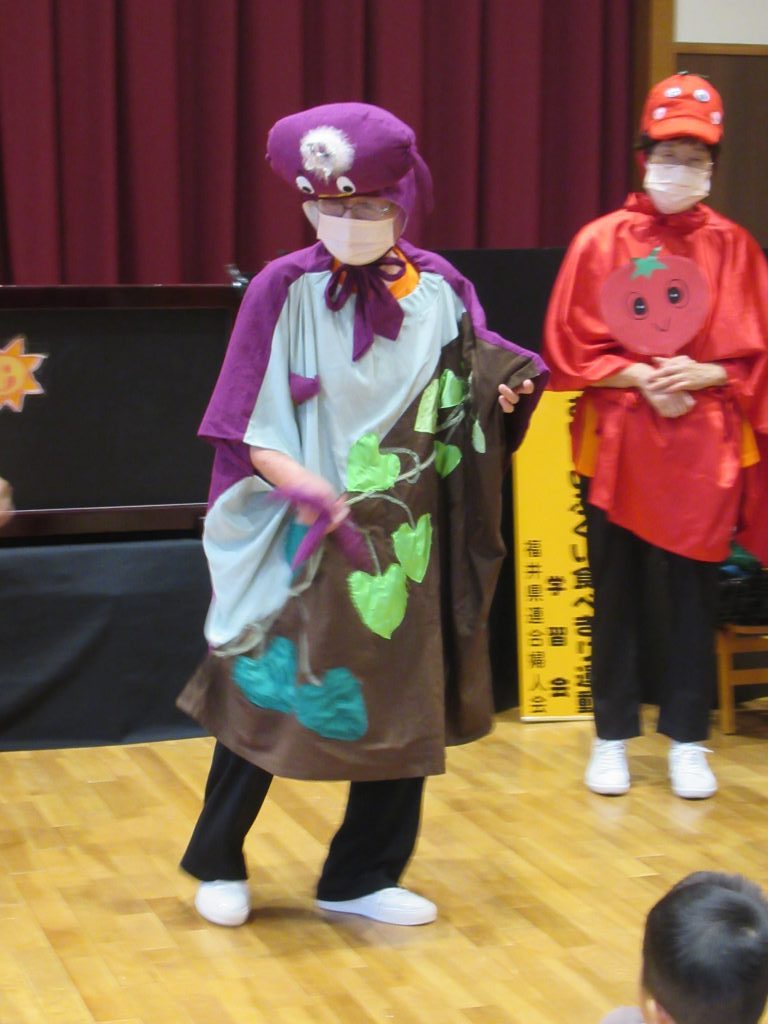 食べきり運動 2024/10/02 おいしいふくい食べきり運動の一環で、福井県婦人会連合による「おいしいふくい食べきり運動学習会」の 紙芝居と野菜の寸劇とダンスを楽しみました 様々な野菜に扮したメンバーの方々から、いろんな野菜を教えてもらえました みんな、残さずに食べきることを約束しました