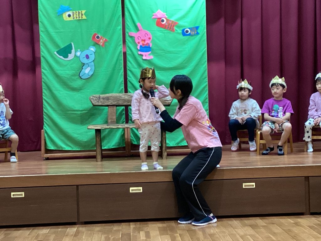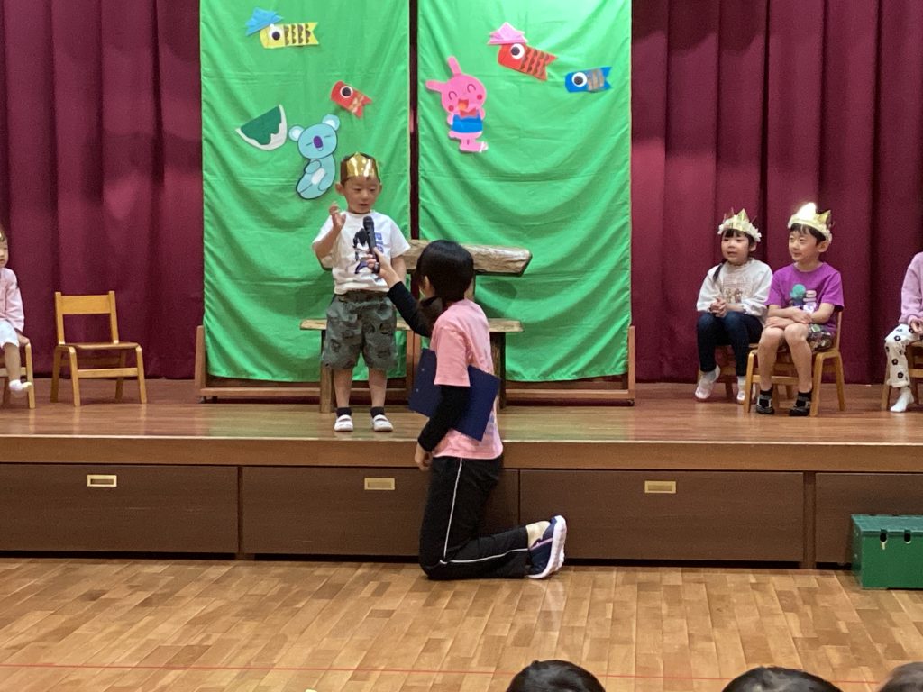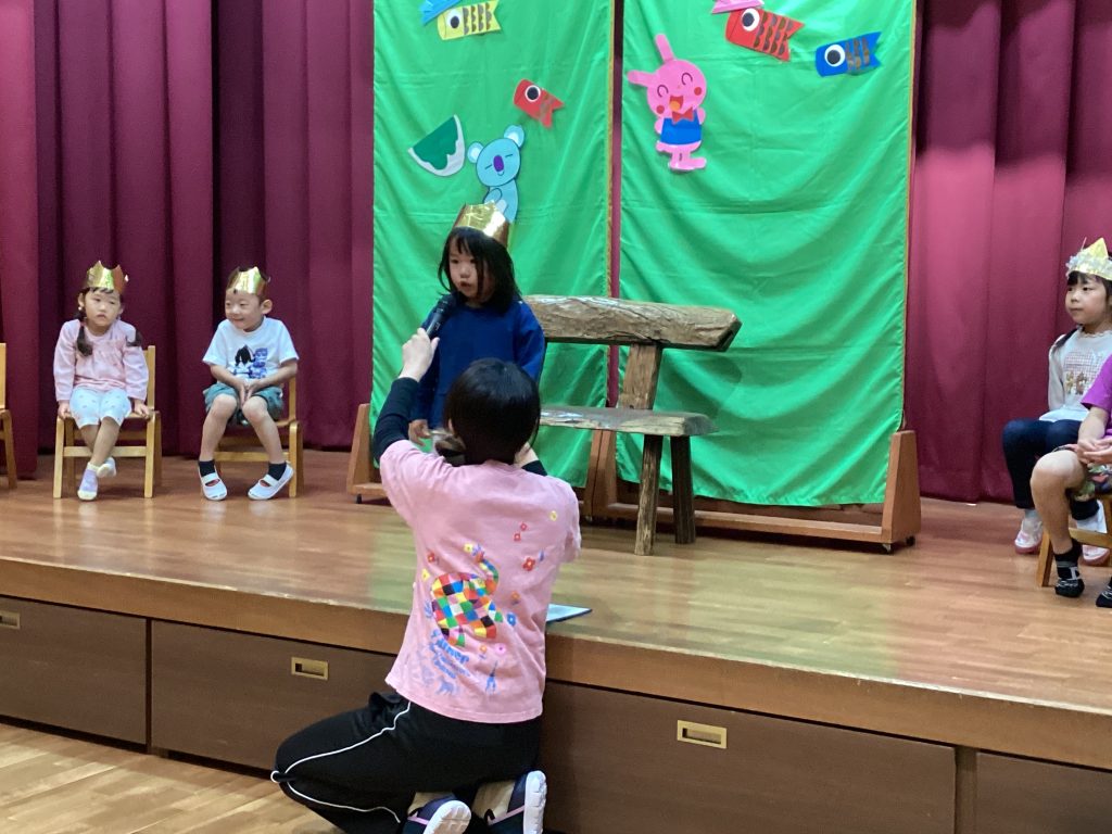 5月の誕生会(たてわりクラス) 2025/05/08 みんなの拍手で入場した誕生会。自己紹介はとっても緊張した表情でした。ふじ組さんは、マイクを持って名前、誕生日、年齢、住所を発表しました。みんなの目が向く中、頑張りました。先生たちのお楽しみでは、大きなこいのぼりが登場!大興奮の子どもたちの頭の上を泳いでいきました。