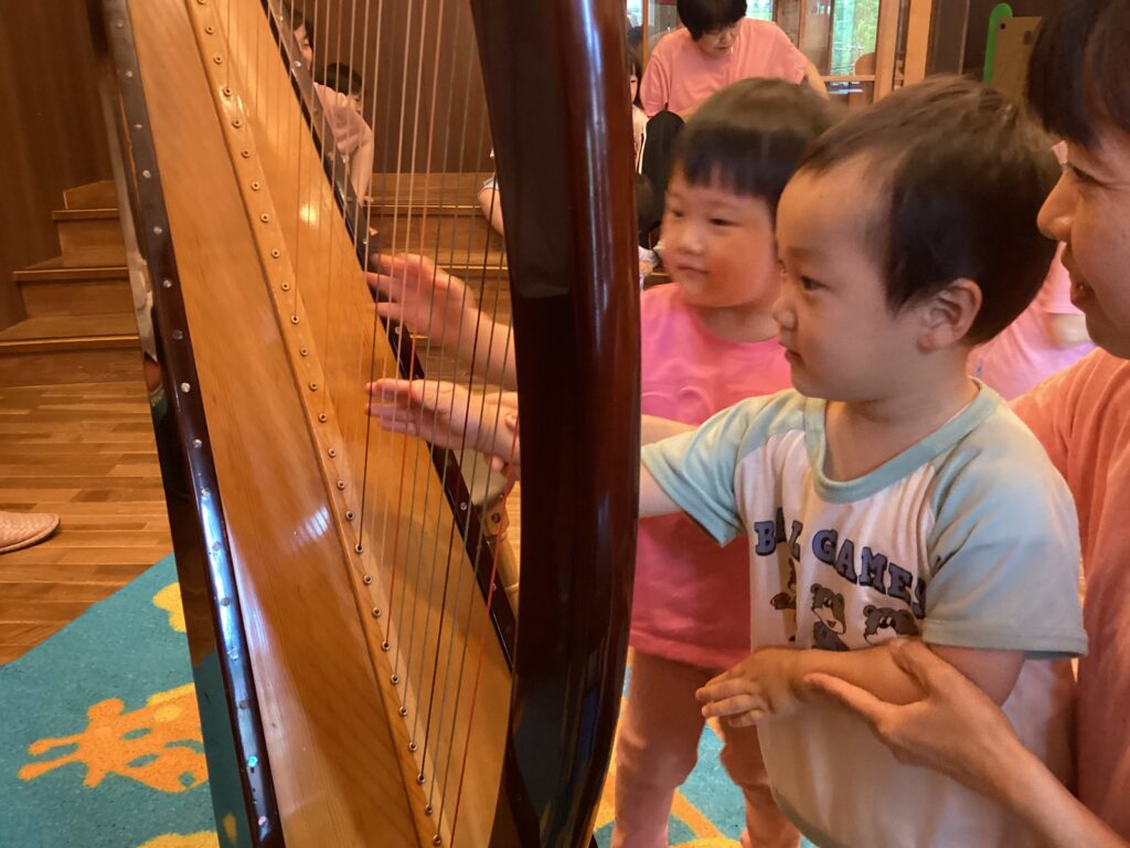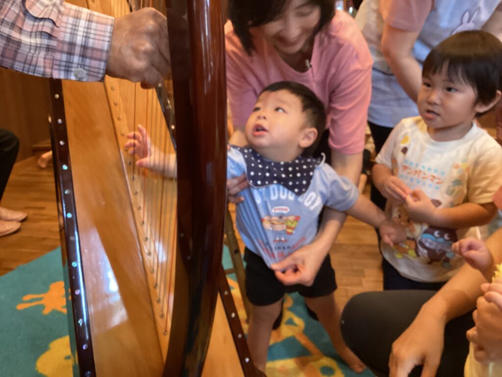 6月の誕生会(未満児クラス) 2025/06/12 誕生会がありました。お返事をしたり、名前を言ったりと元気いっぱいでしたよ。みんな大好き、カエルさんが登場!!梅雨入りしたこの季節にぴったりのお楽しみで、大興奮の子どもたちでした。 すくすくキッズの行事であるハープ演奏会にも参加させてもらい、実際にハープに触れ音を鳴らすこともできました。とてもいい経験ができました。