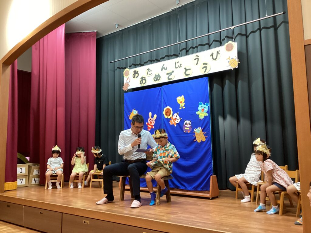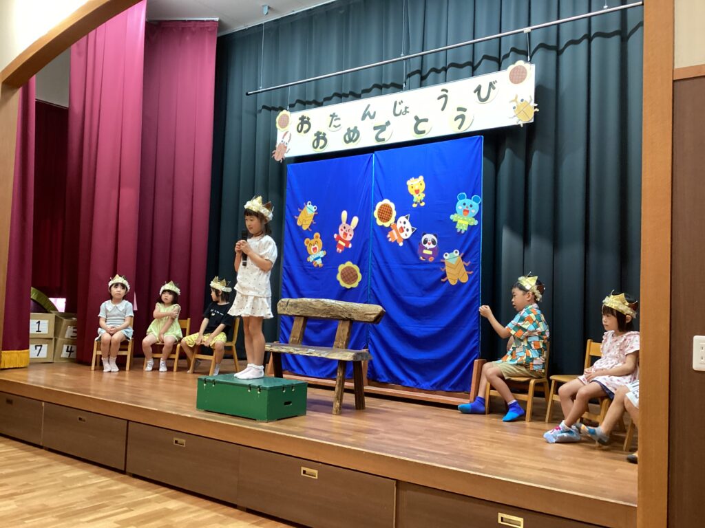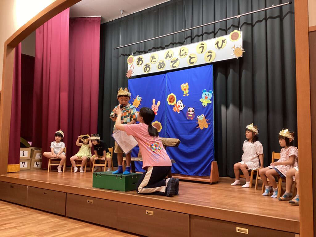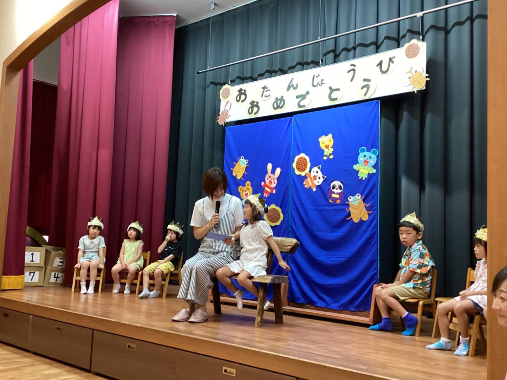 8月の誕生会(以上児) 2025/08/07 8月生まれのお友だちの誕生会がありました。「お名前は?」と聞かれると、ドキドキしながらもしっかりと答えていましたよ。みんなでうたう♪誕生日って♪も上手にうたい、心のこもった誕生会になりました。先生たちによる夏にちなんだお楽しみも、笑顔いっぱいで参加しました。