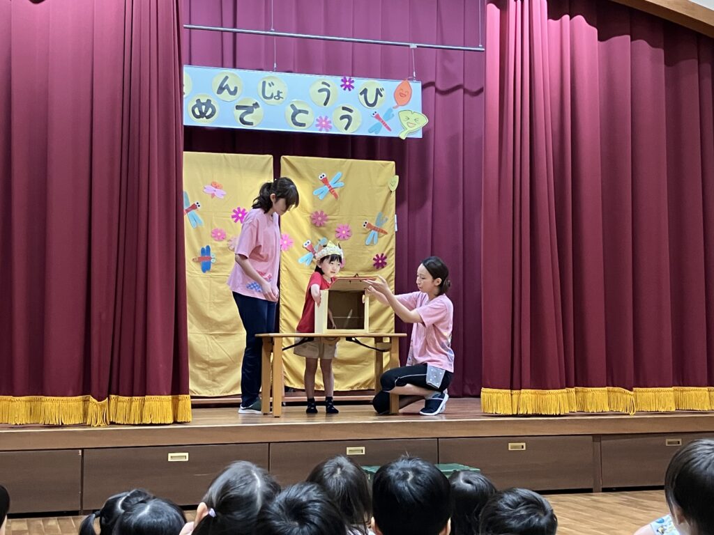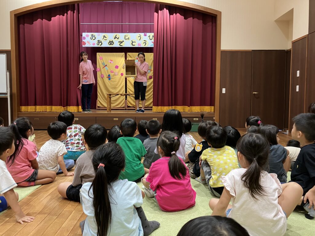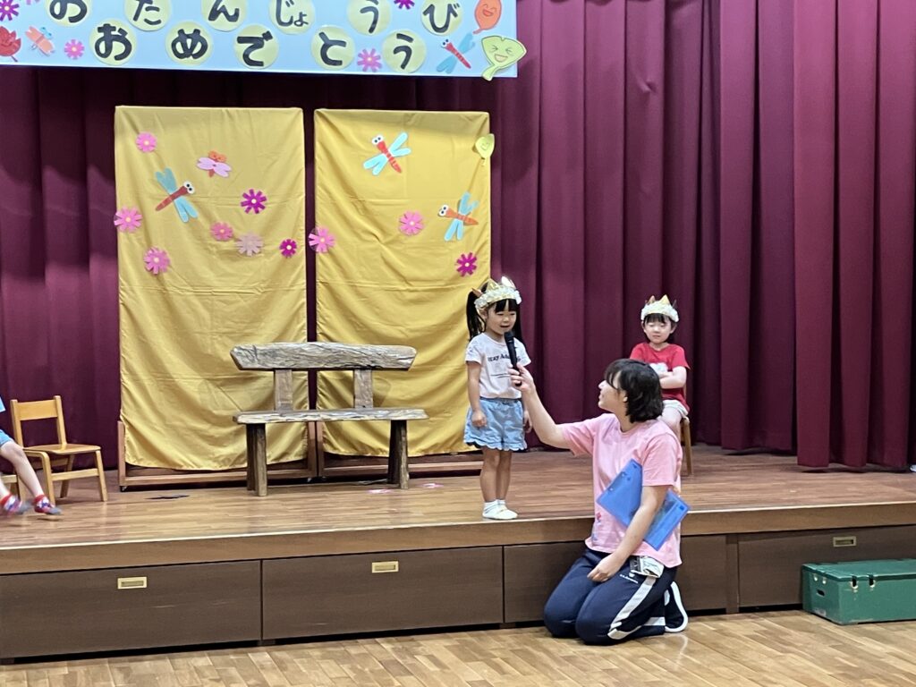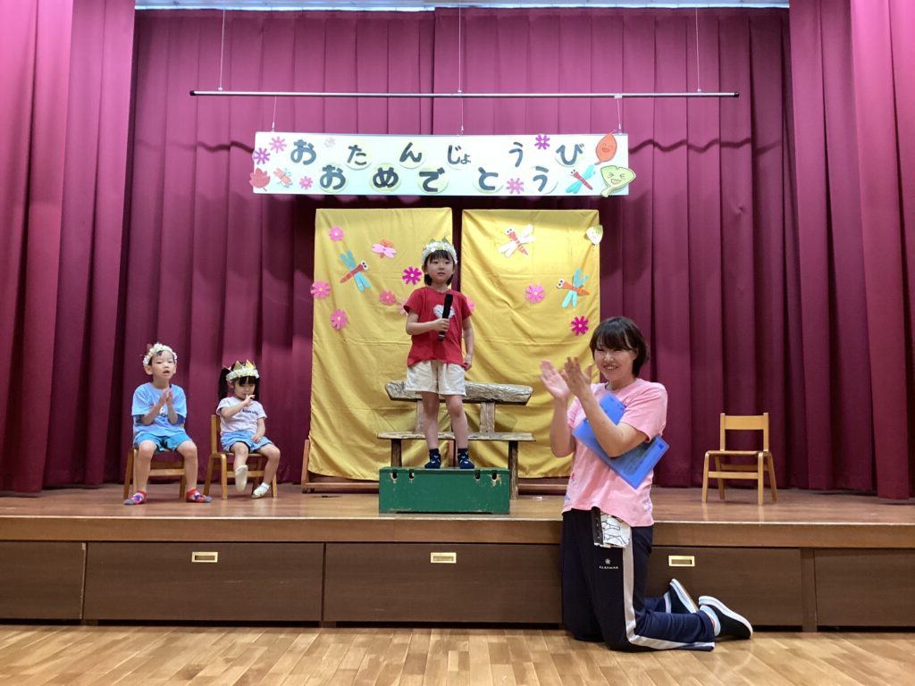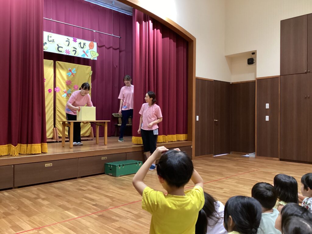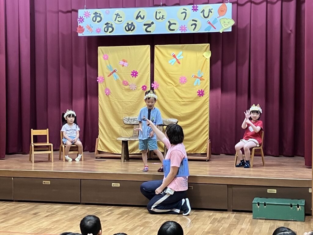9月の誕生会(以上児) 2025/09/04 今日は、9月の誕生会🎉3名のお友だちがステージに上がりました。自己紹介をし、たくさんの拍手をもらい満足そうな子どもたちでしたよ🥰先生たちのお楽しみは「箱の中身はなんだろなぁ~?」でした。中身が見えない箱に手を入れて物を当てるクイズは大好評で、笑顔いっぱいの誕生会になりました。
