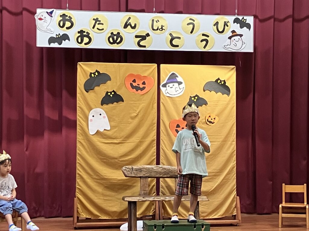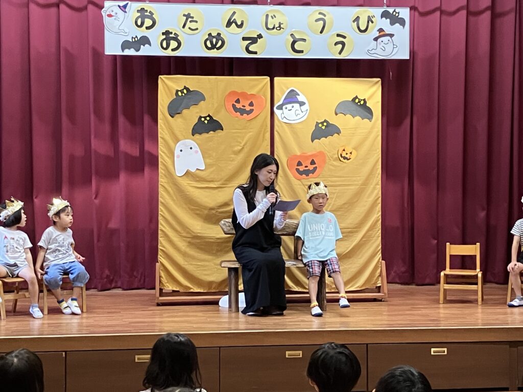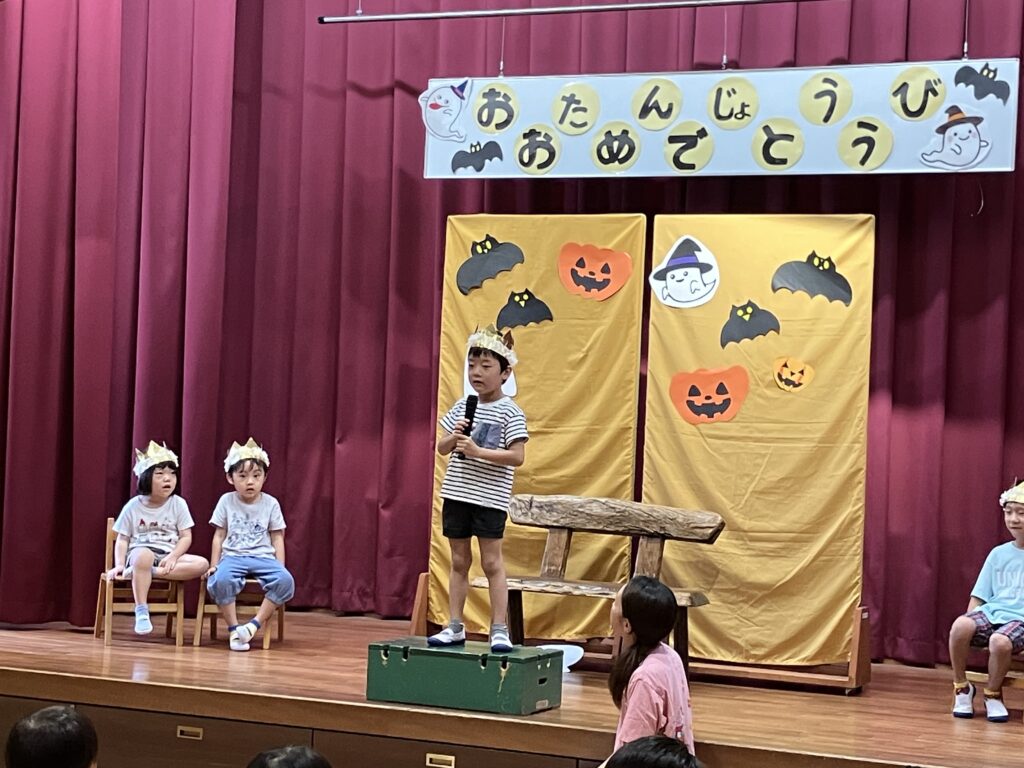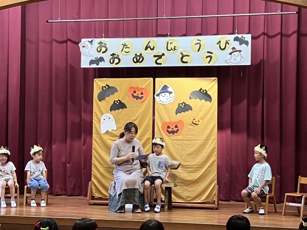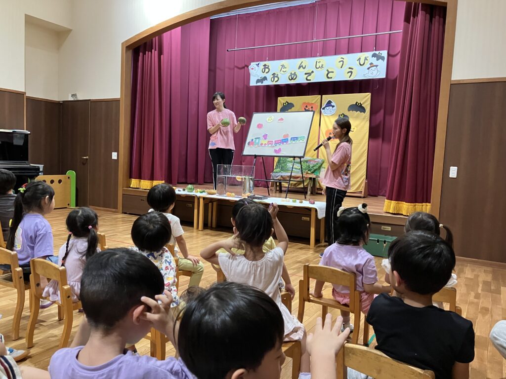 10月の誕生会(以上児) 2025/10/02 今日は10月生まれの誕生会の日です。大勢の前で緊張した表情の子どもたちでしたが、上手に自己紹介をしみんなから“おめでとう”拍手をもらいました。先生たちのお楽しみは「浮かぶかな?沈むかな?」と、いろいろな果物や野菜を水槽に浮かべるクイズでした。浮かぶもの、沈むもの・・・子どもたち、保護者の方、職員も一緒に楽しめたお楽しみでした。