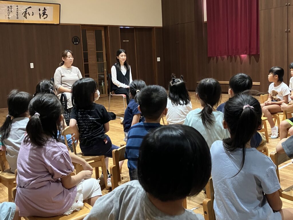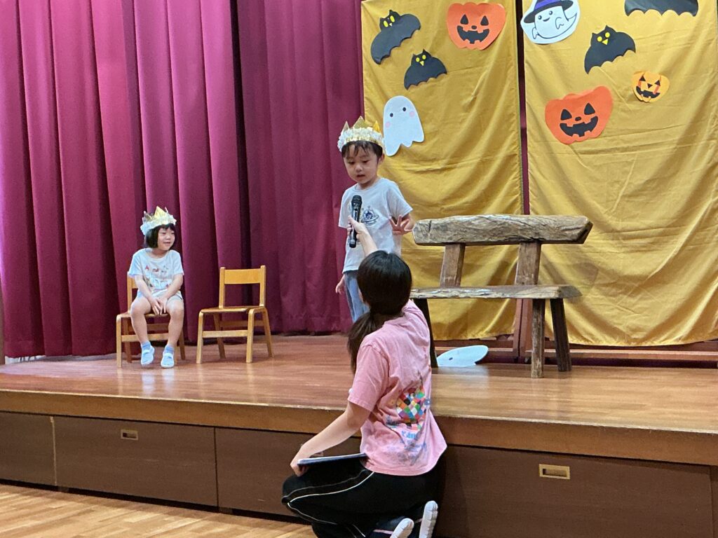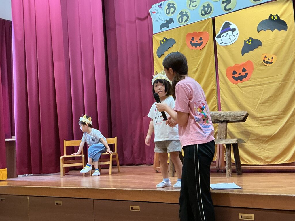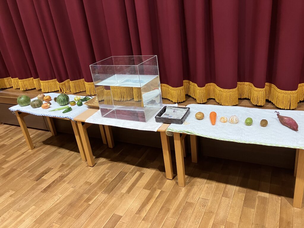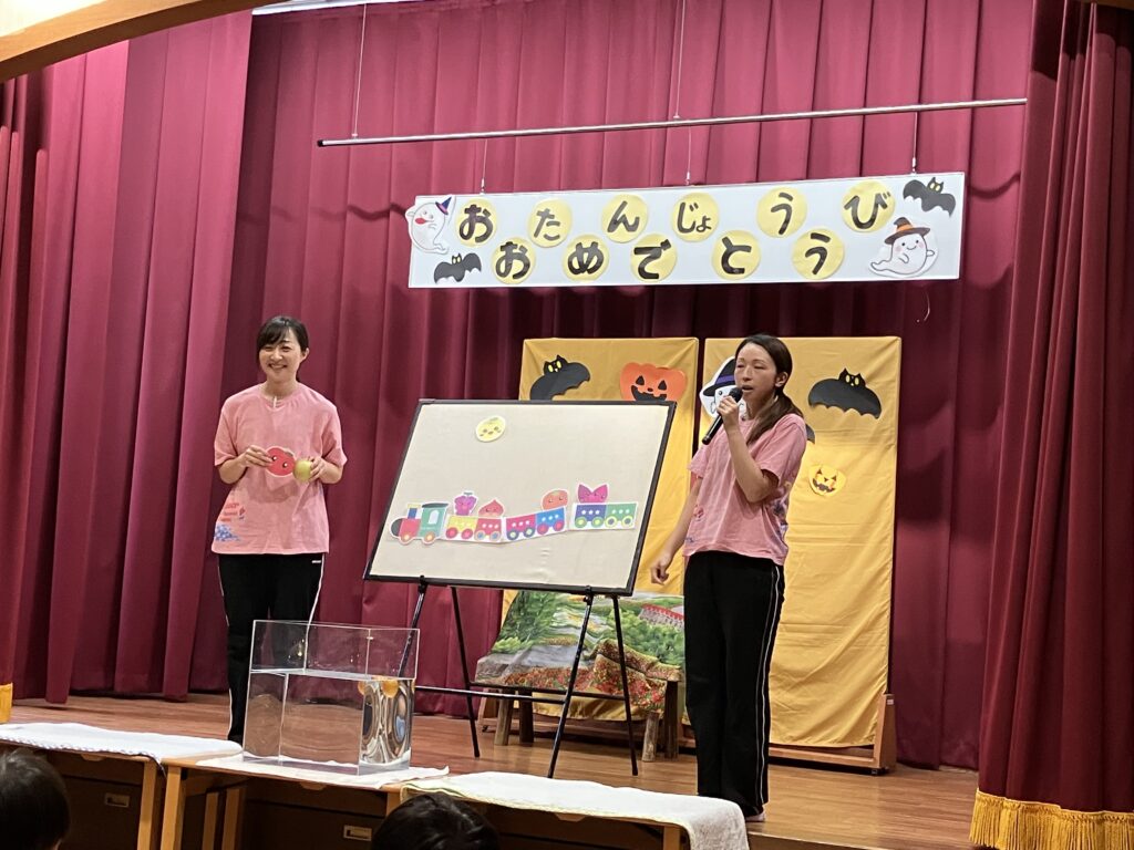 10月の誕生会(以上児) 2025/10/02 今日は10月生まれの誕生会の日です。大勢の前で緊張した表情の子どもたちでしたが、上手に自己紹介をしみんなから“おめでとう”拍手をもらいました。先生たちのお楽しみは「浮かぶかな?沈むかな?」と、いろいろな果物や野菜を水槽に浮かべるクイズでした。浮かぶもの、沈むもの・・・子どもたち、保護者の方、職員も一緒に楽しめたお楽しみでした。