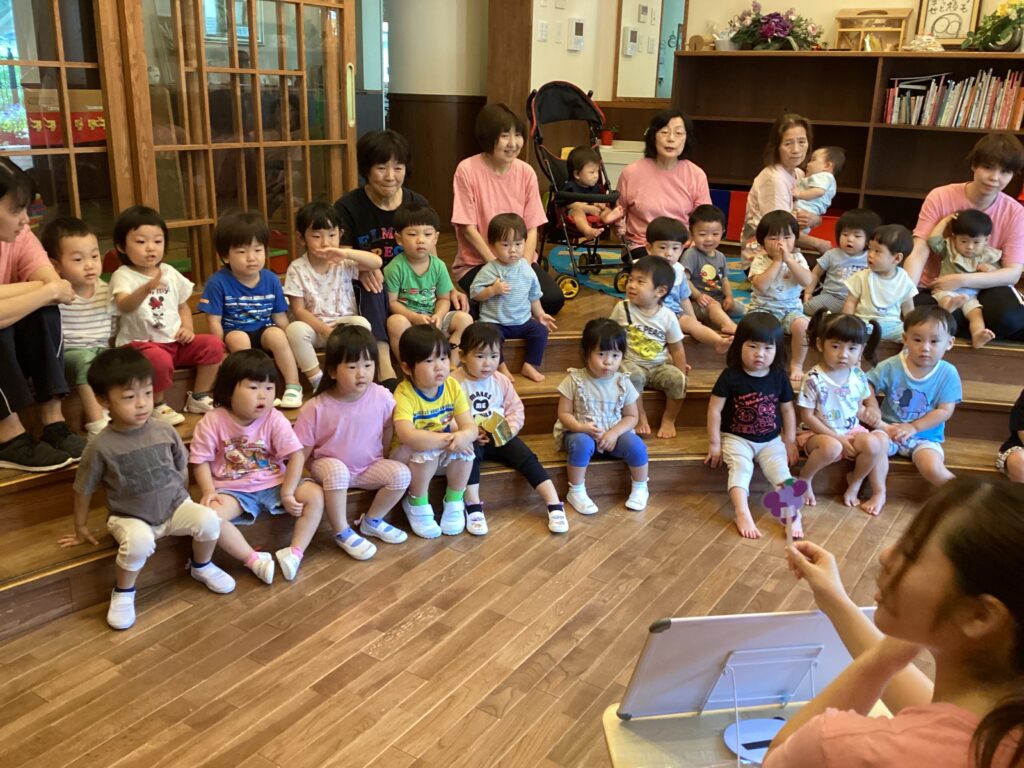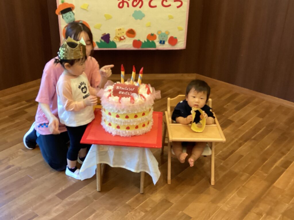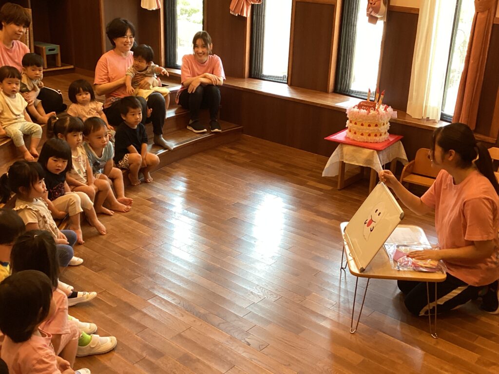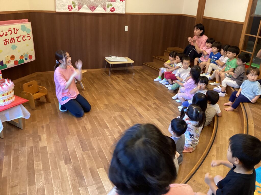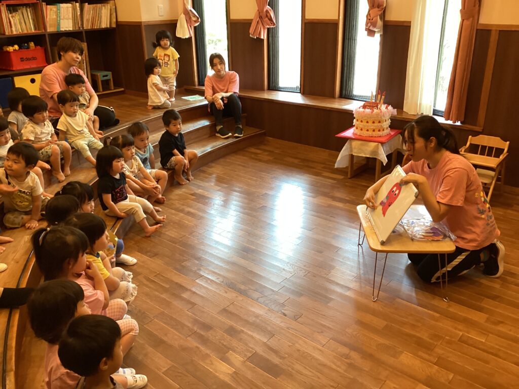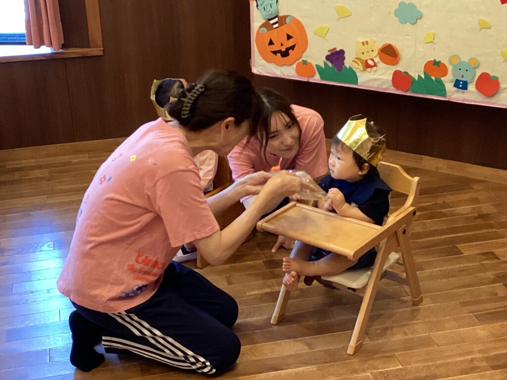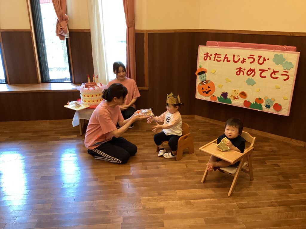 10月の誕生会(未満児) 2025/10/02 2名のお友だちの誕生会がありました。みんなの前で緊張気味でしたが、名前や年齢を発表し拍手をもらって笑顔いっぱいの誕生会でした。お楽しみは「ばけばけばけたくん」の絵本をモチーフにした、食べ物を食べたおばけが変身するパネルシアターでした。いろんな果物や食べ物を食べてお化けが大変身!!最後はろうそくを吹き消して、おばけとはバイバ~イ👋子どもたちも真剣に見ていましたよ。