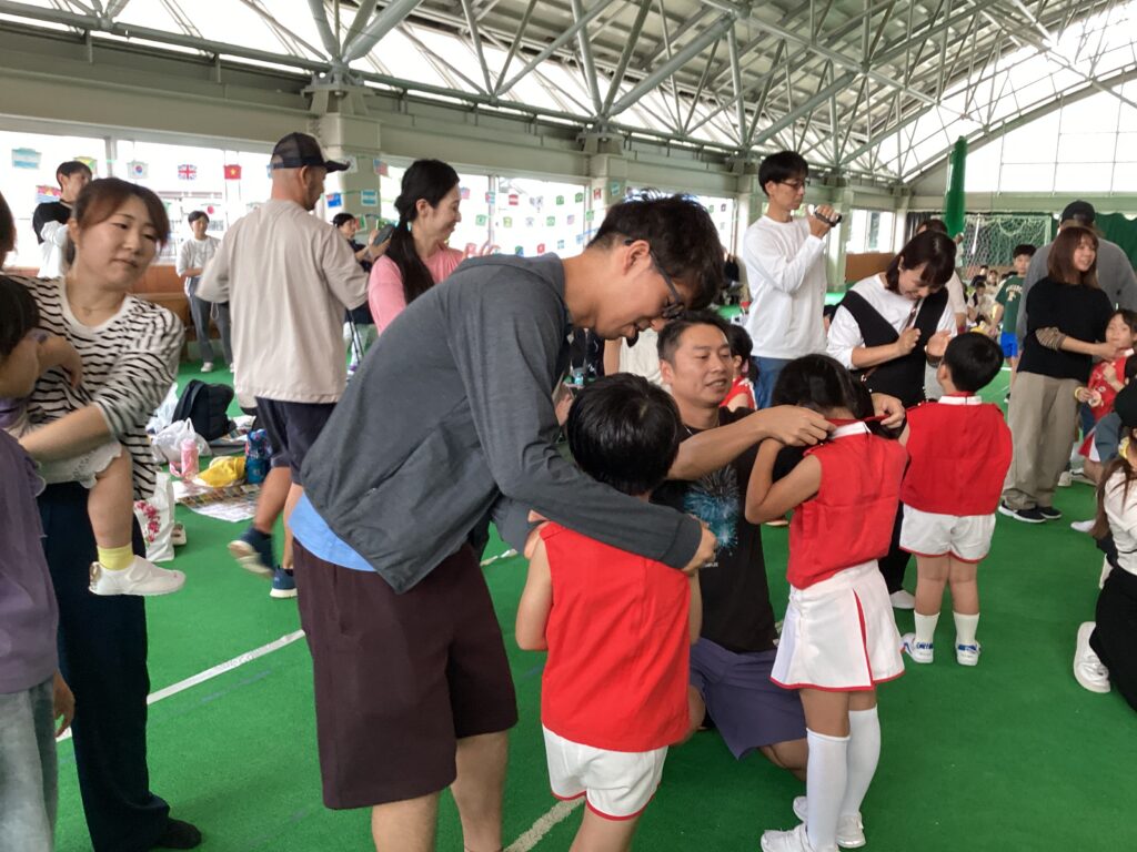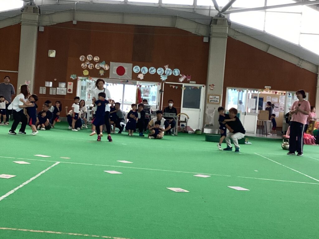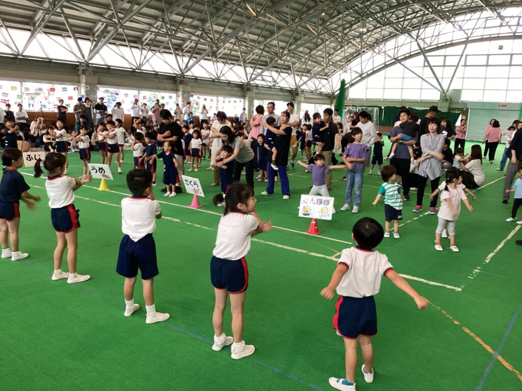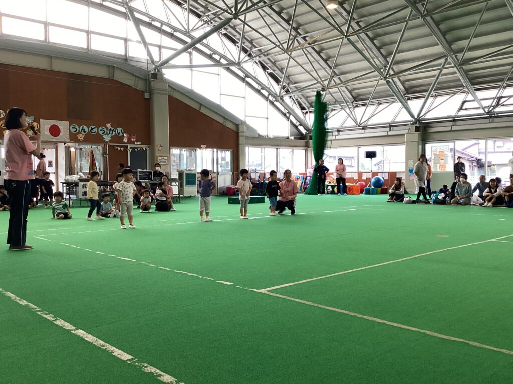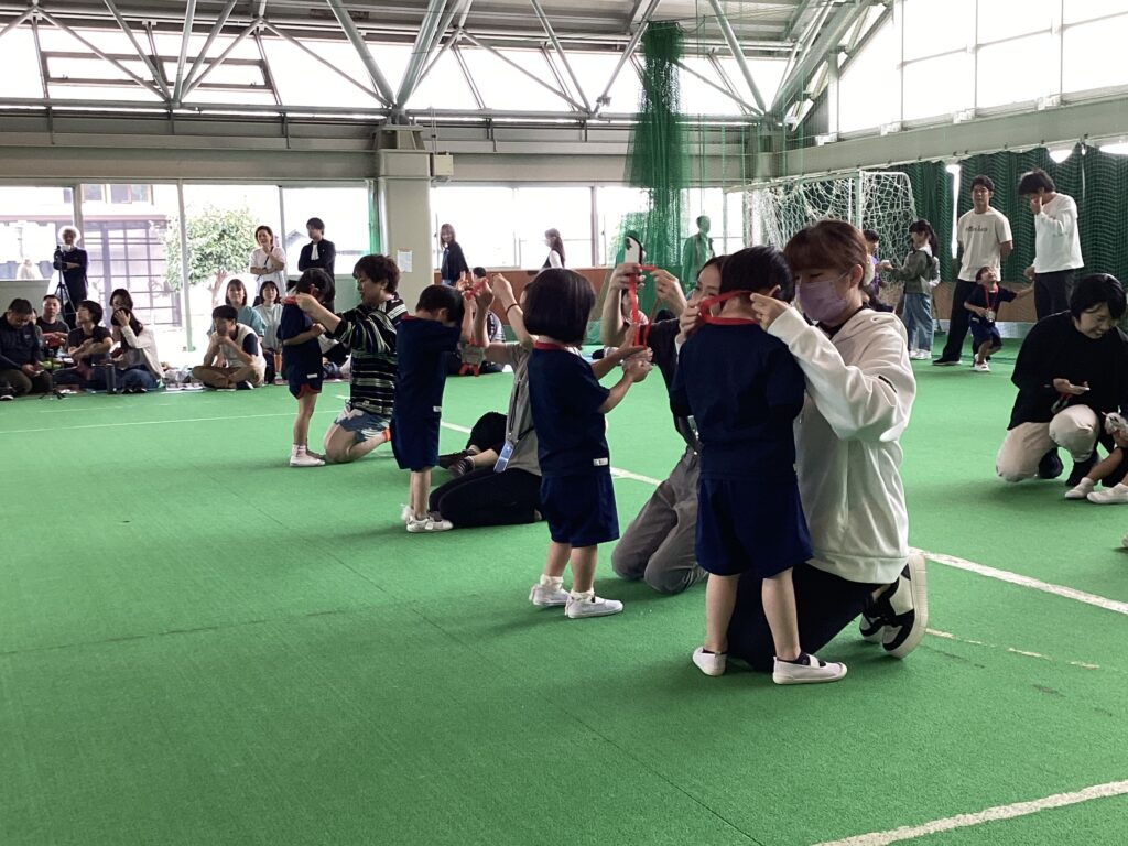 10月11日(土)に、第52回親子ふれあいうんどう会がふれあいドームにて行われました。かけっこをしたり、親子競技をしたりと子どもたちはとてもいい笑顔で参加できました。競技の大トリは、ふじぐみとうめぐみによるマーチング&マスゲームでした。たくさん練習した成果をおうちの人に見てもらうことができました。閉会式では、おうちの人の手作りの“世界に一つだけのメダル”を首にかけてもらい、大満足な子どもたちでしたよ。メダル製作のご協力ありがとうございました。