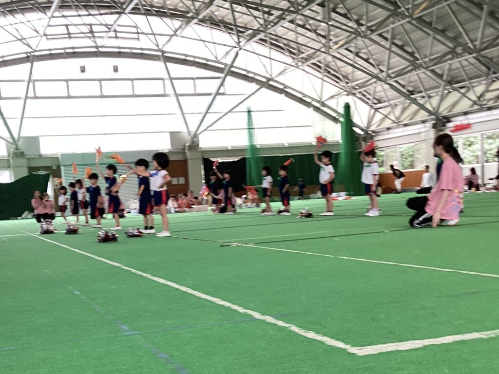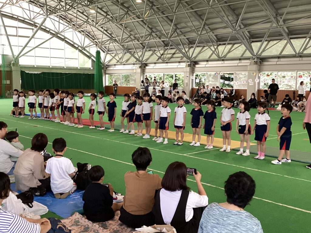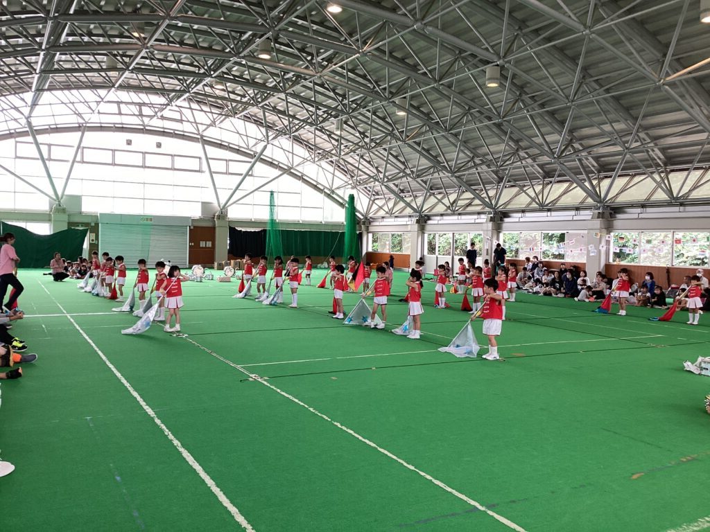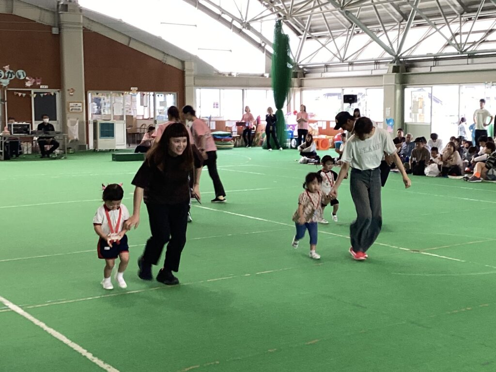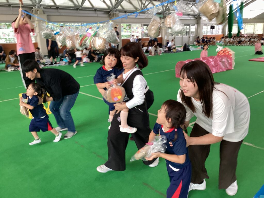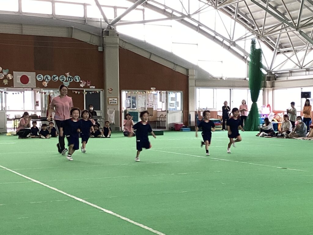 10月11日(土)に、第52回親子ふれあいうんどう会がふれあいドームにて行われました。かけっこをしたり、親子競技をしたりと子どもたちはとてもいい笑顔で参加できました。競技の大トリは、ふじぐみとうめぐみによるマーチング&マスゲームでした。たくさん練習した成果をおうちの人に見てもらうことができました。閉会式では、おうちの人の手作りの“世界に一つだけのメダル”を首にかけてもらい、大満足な子どもたちでしたよ。メダル製作のご協力ありがとうございました。