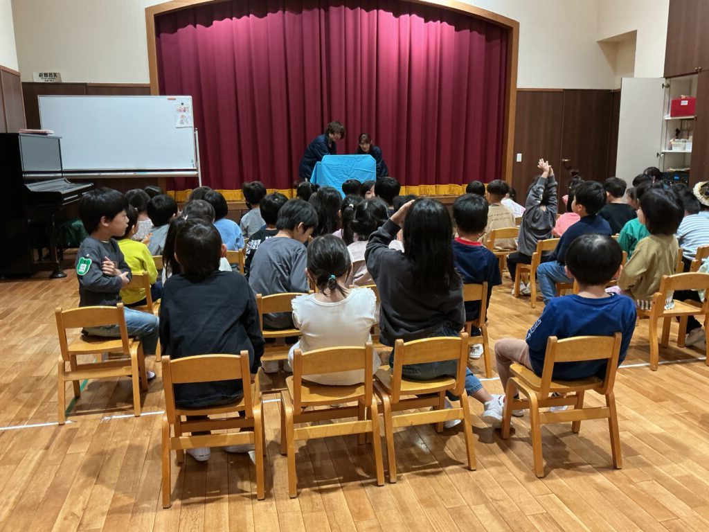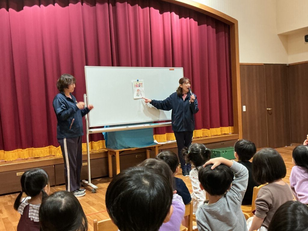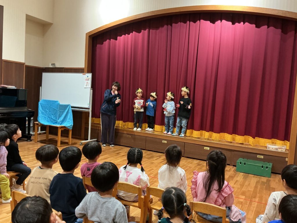 11月生まれのお友だちの誕生会がありました。大勢のお友だちの前で名前と年齢を言いましました。年長さんはおうちの方が見ている中でマイクを持ち、名前・誕生日・年齢・住所を発表しました。緊張感の漂う中、頑張っていましたよ!!先生のお楽しみは、❝秋のクイズ&どんな音が聞こえるかな?❞でした。みんなに見えない、カーテンの向こうから聞こえる楽器の音・・・よーく耳を澄ませて聞いていた子どもたち👂最後は11月生まれのお友だちと演奏をしました🎵