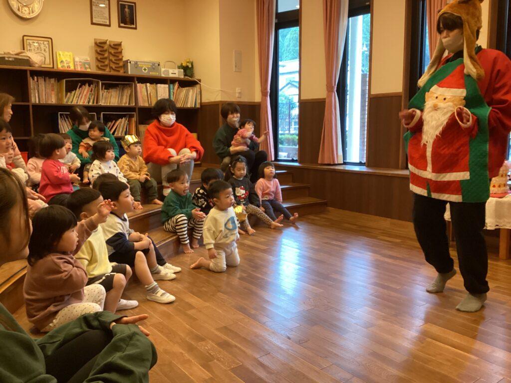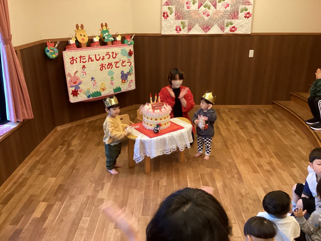 12月の誕生会(未満児) 2025/12/25 12月生まれの誕生会がありました。先生に名前を呼んでもらうと、上手に手を挙げて「はい✋」と返事をし冠をかぶりました。お友だちの前に座り、誕生日のうたをうたってもらうと嬉しそうな表情をしていましたよ。園長先生からもプレゼンをもらいました。
