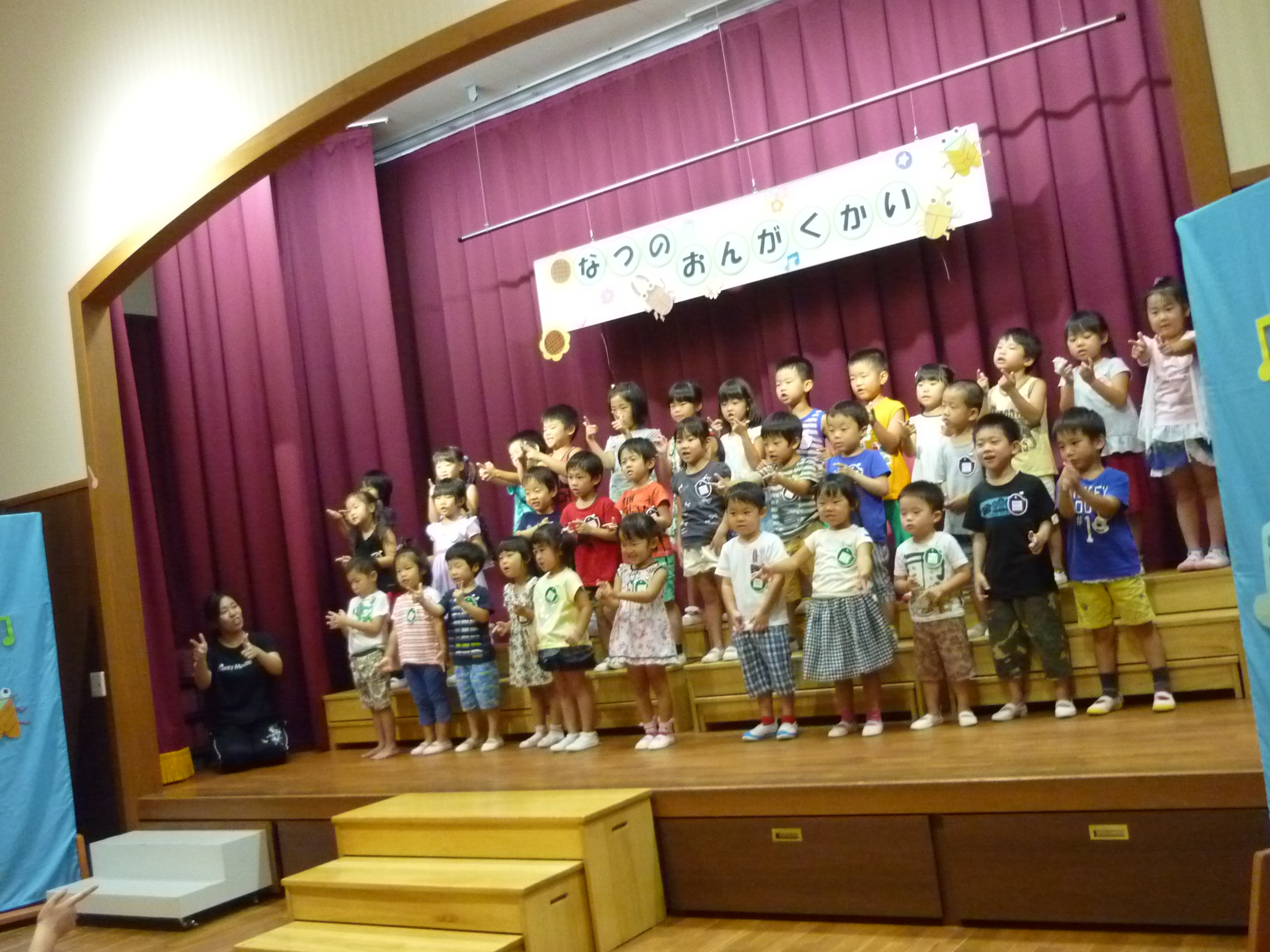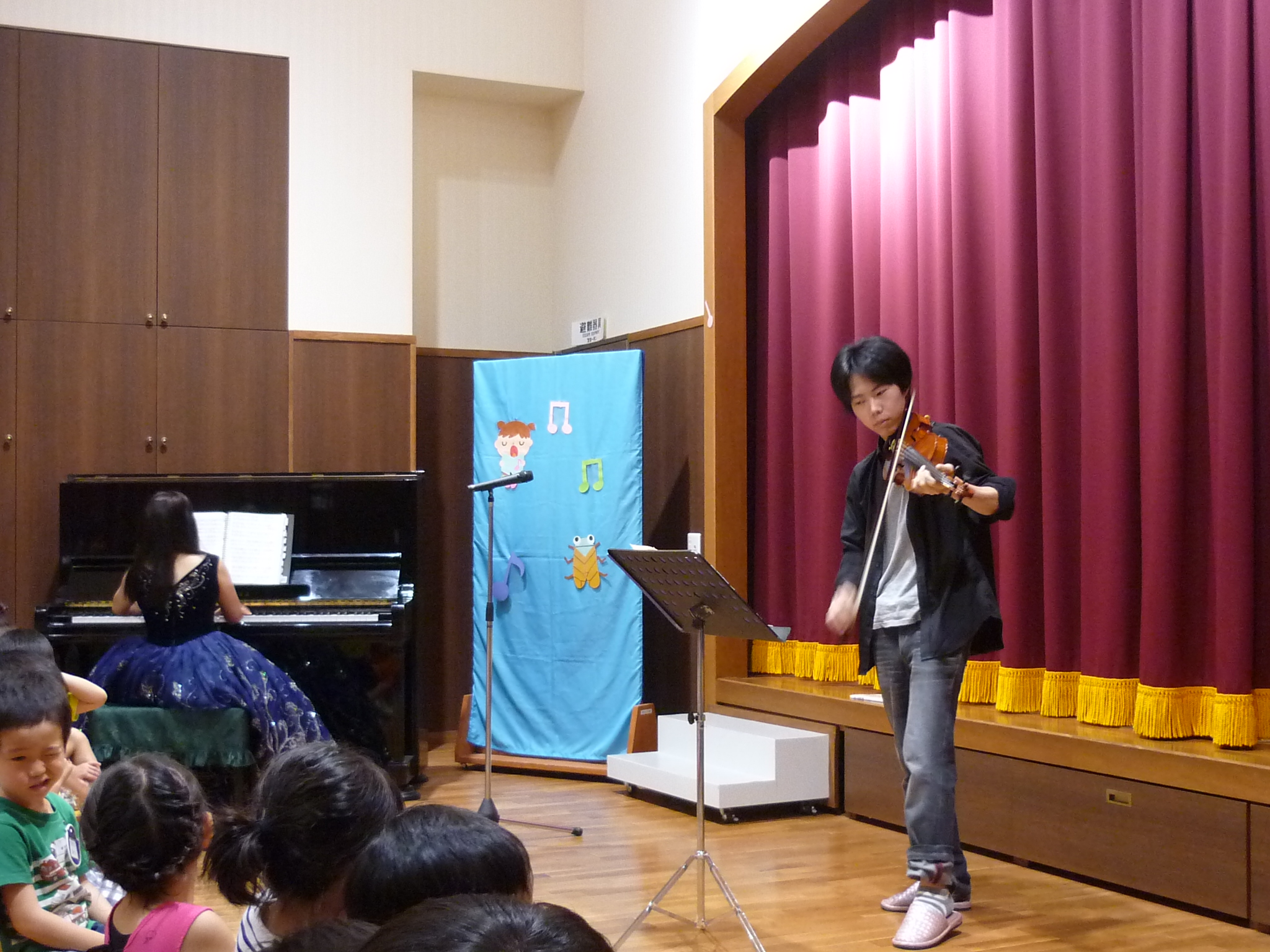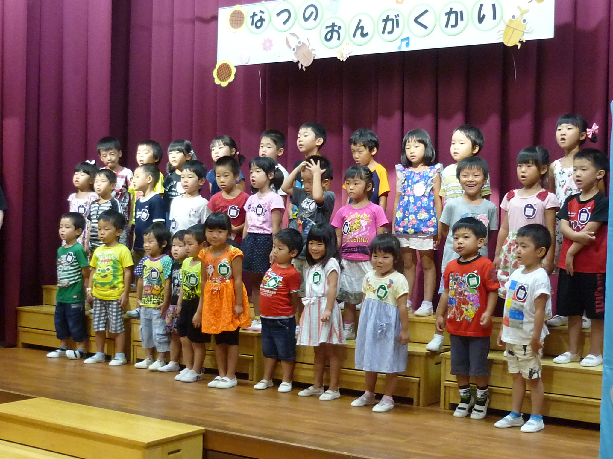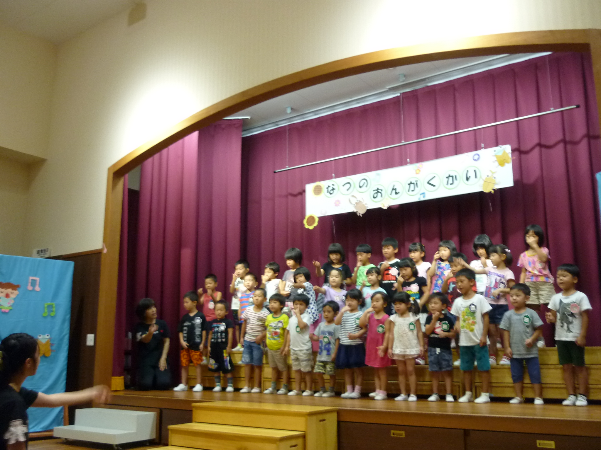 夏の音楽会 (うめ組 もみじの会) 2017/08/28 8月23日(水)に夏の音楽会を開きました うめ組さんのおじいちゃんおばあちゃんをお誘いして各クラスの夏の童謡のステージと ピアノとヴァイオリンのセッションのミニコンサートを聴きました。 子どもたちのステージと素敵なピアノとヴァイオリンのステージとで優しい音色の響く音楽会となりました。
