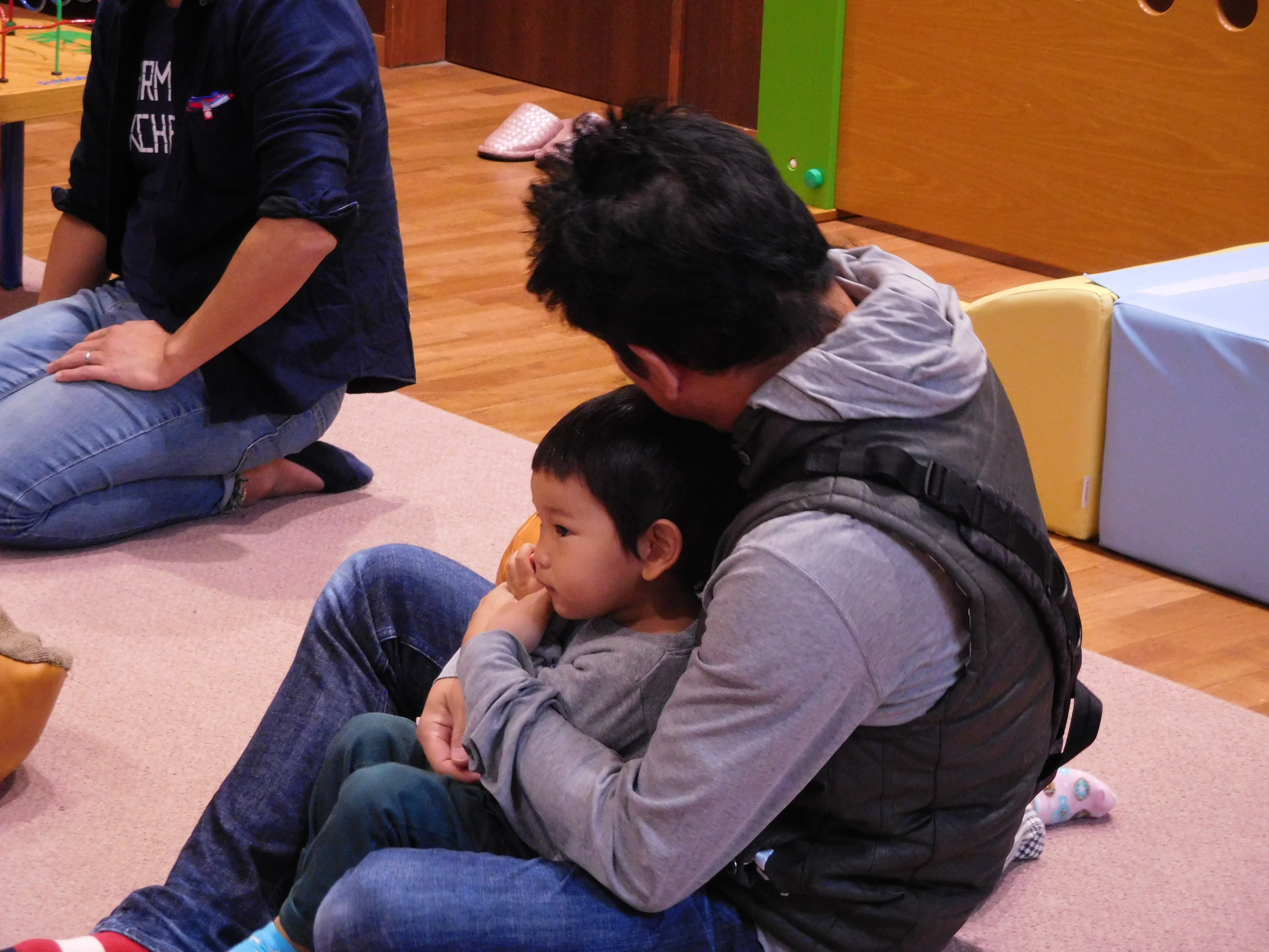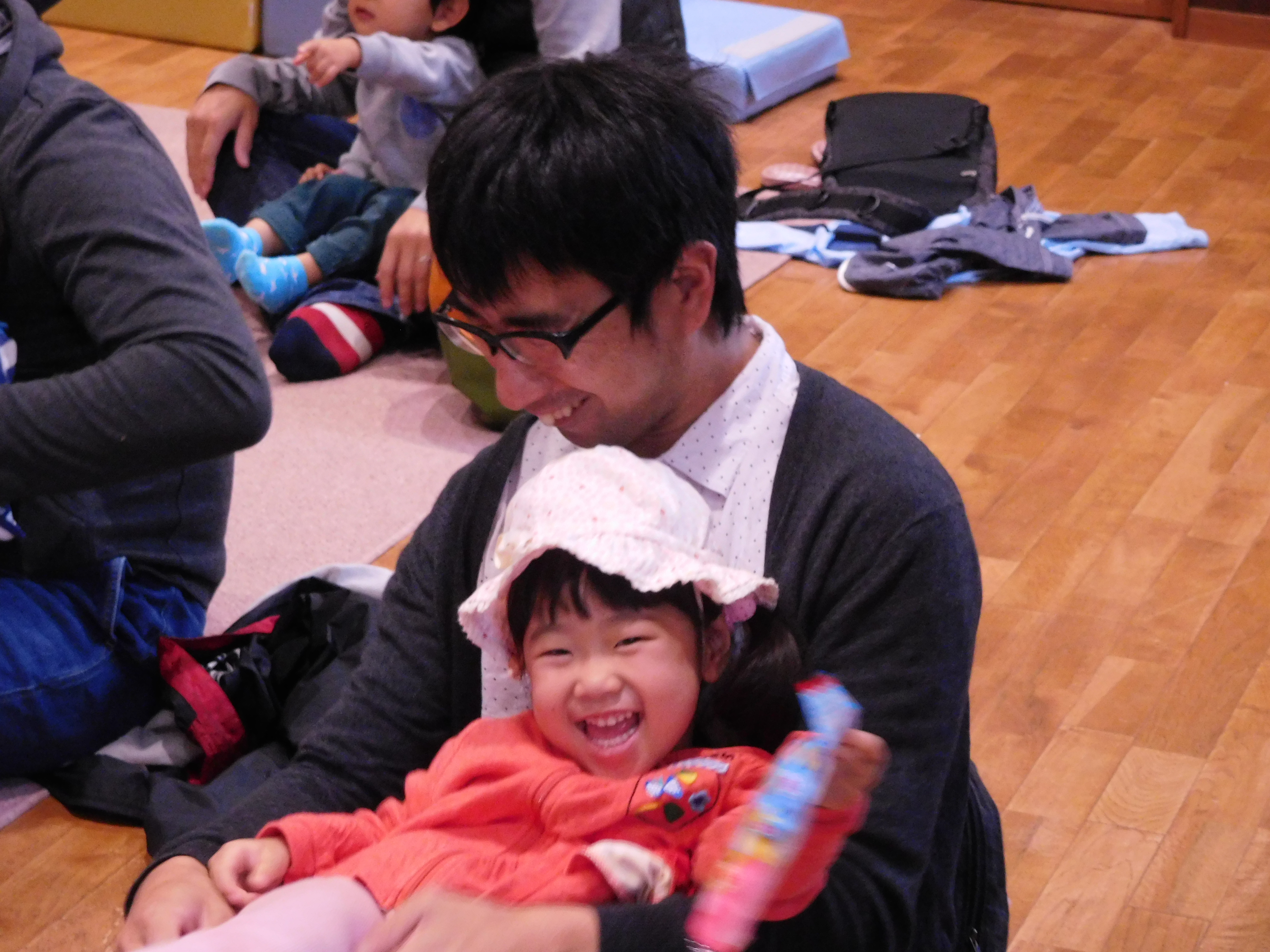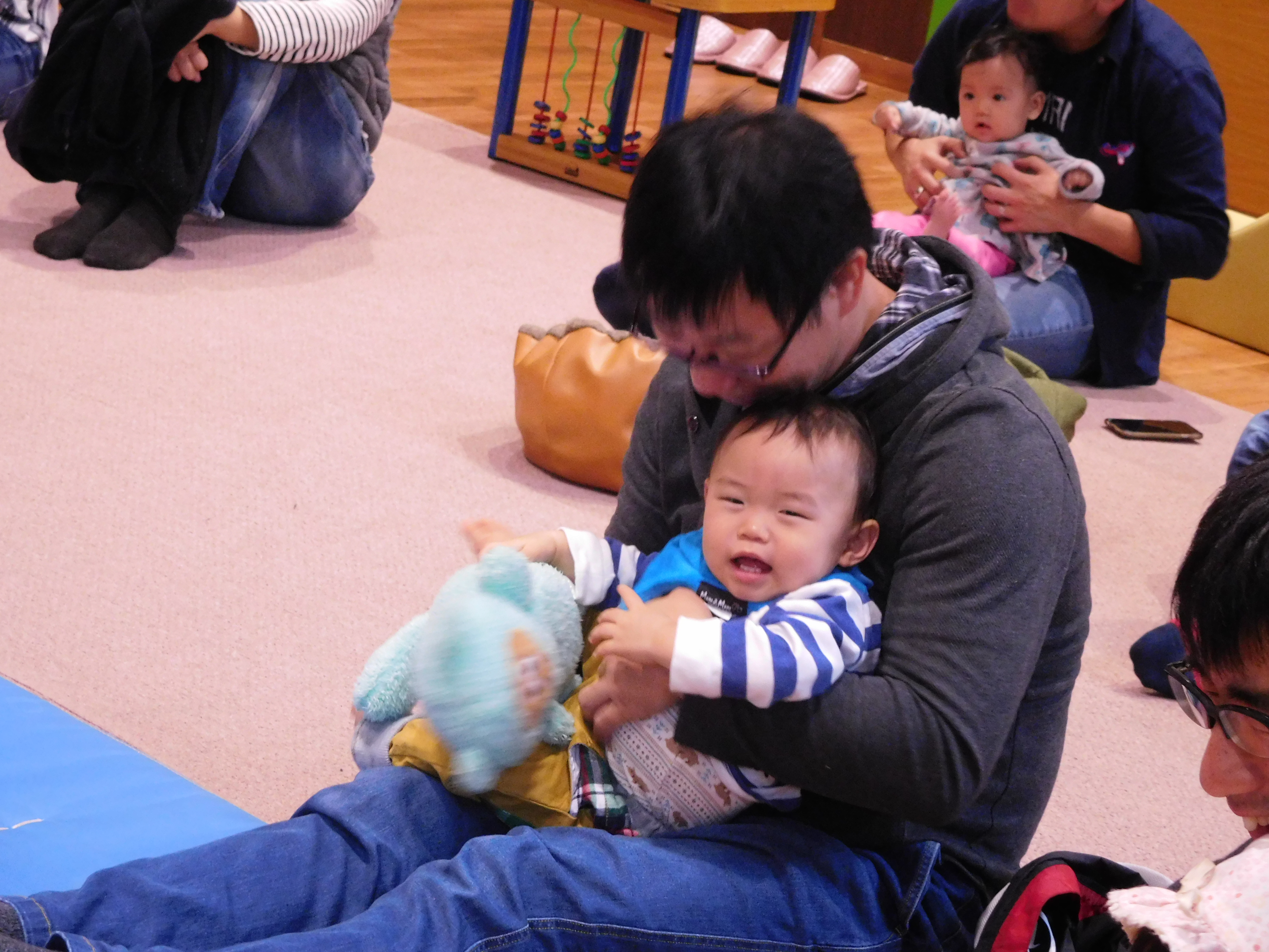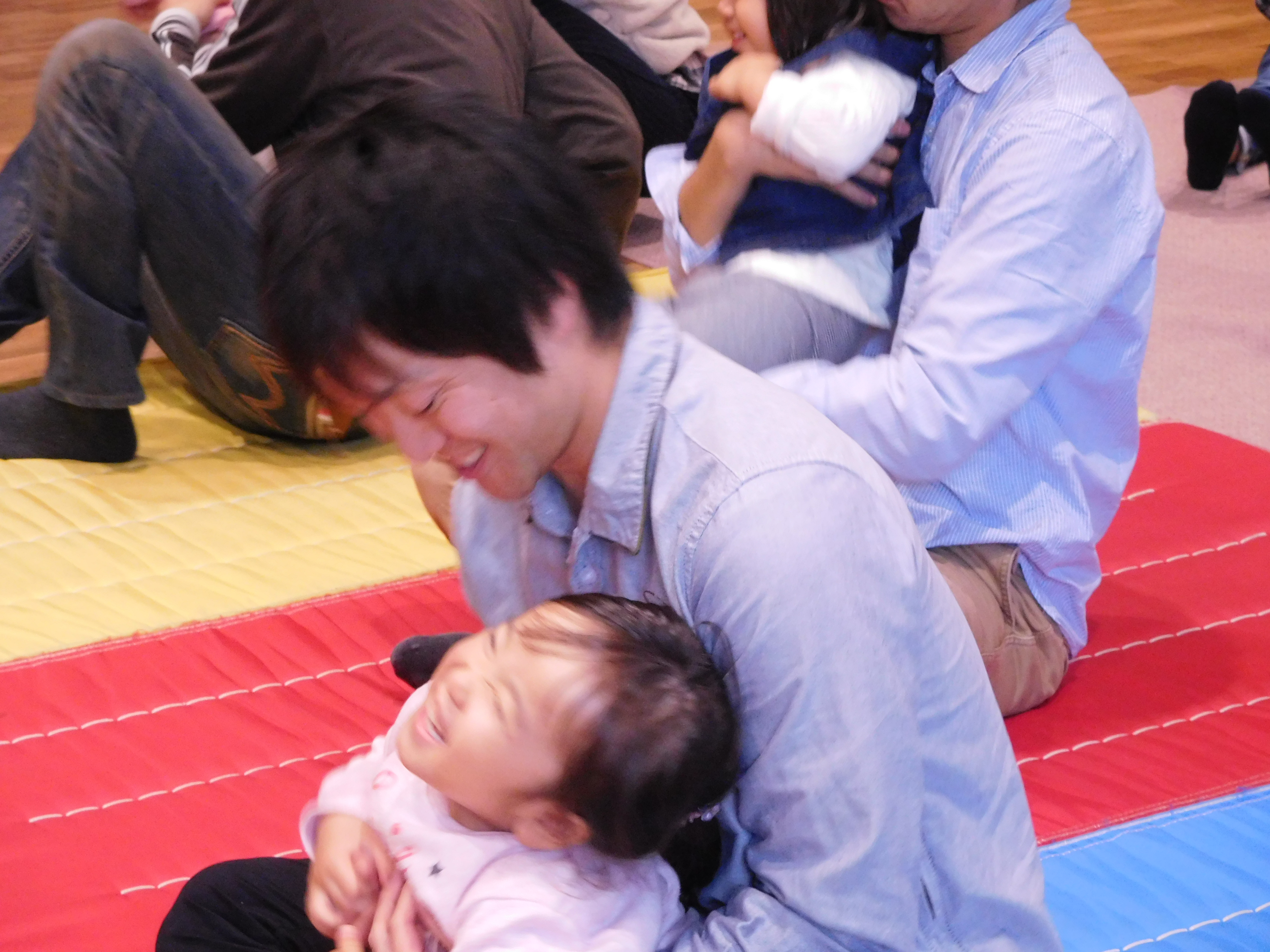 NPO法人 パパHNDSの岡田氏を招いて、絵本ライブやふれあい遊びでいっぱい笑っていっぱいからだを動かして、お子さんと一緒に楽しい時間を過ごしました