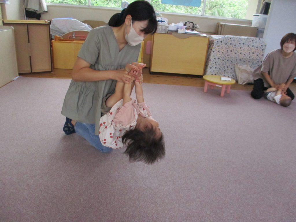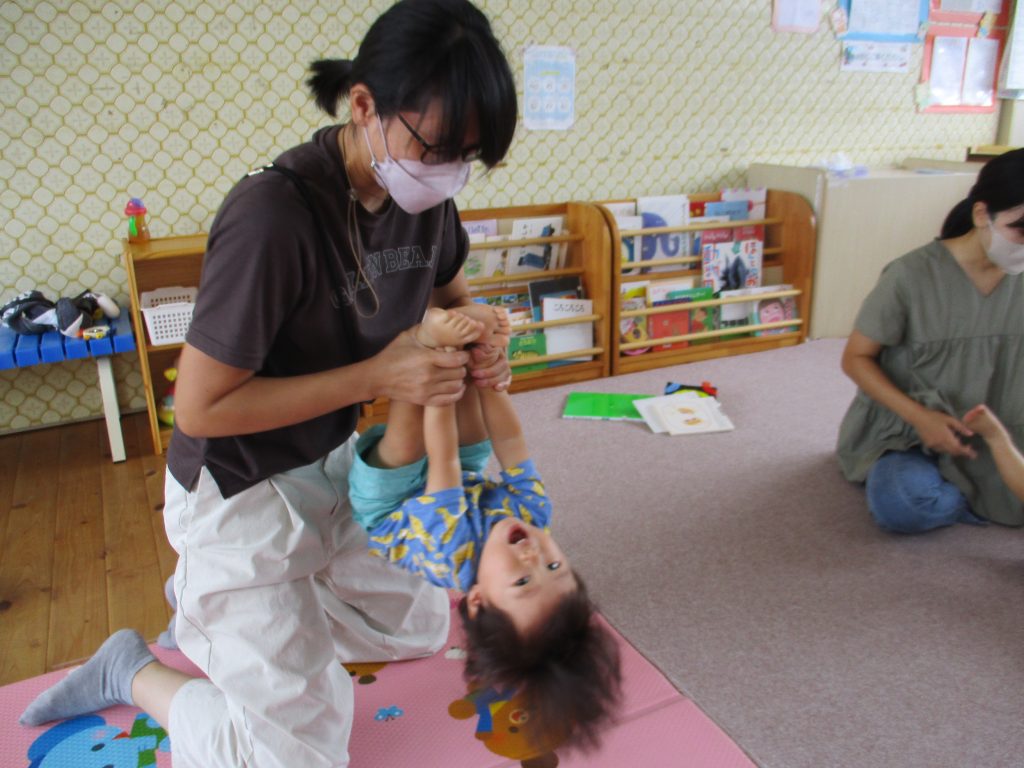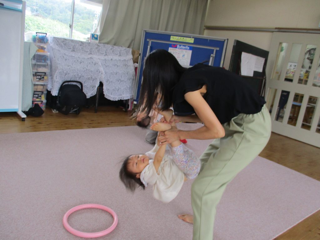 ベビーヨガはお母さんのストレッチにもなり、体を曲げたり、宙づりになったりといろんな動きの経験をしました