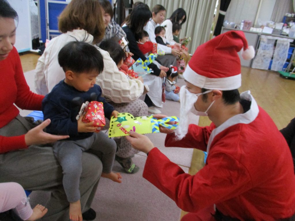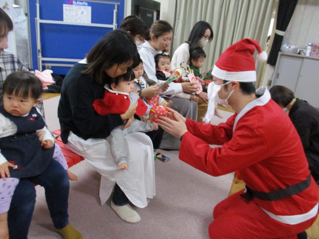 音の鳴る楽器を手にして、いろんな音を楽しんだり、🎁を一人ひとりサンタさんからいただきました