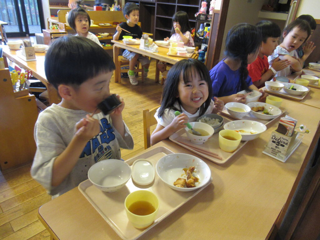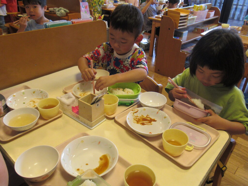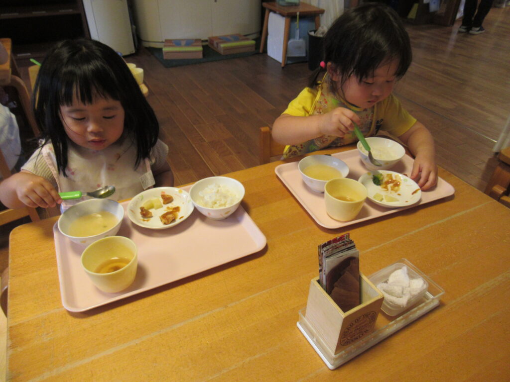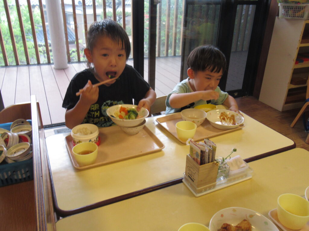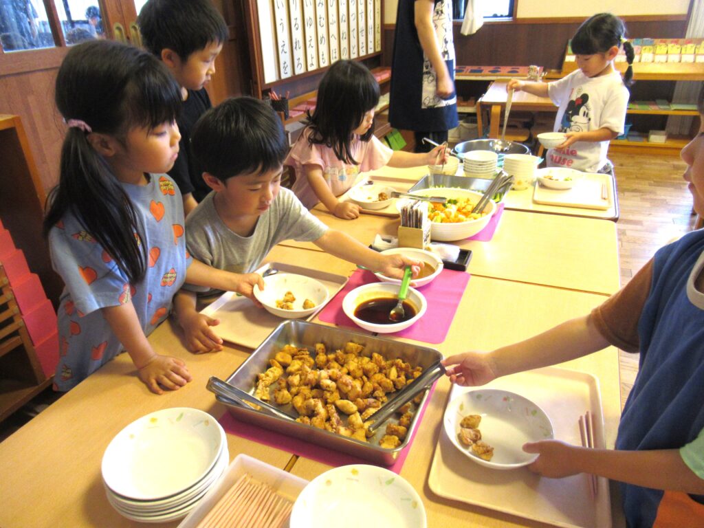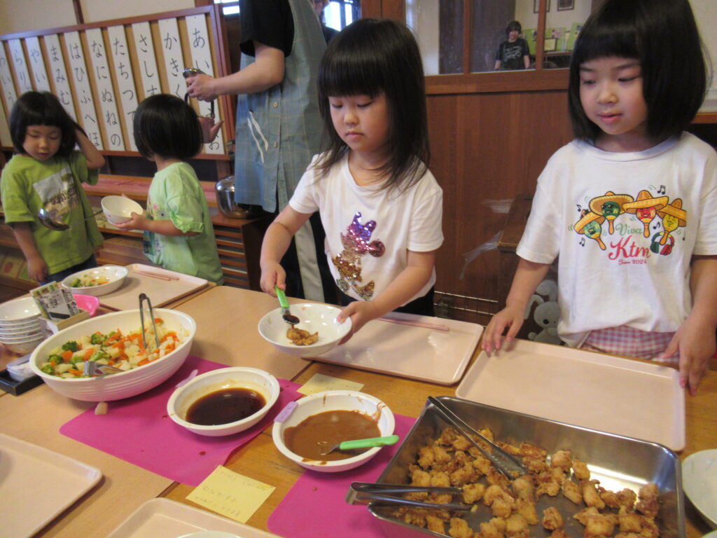 お知らせ2025/06/10 オリジナルメニューの日(ごちソース) 〈幼児食メニュー〉 ・若鶏の唐揚げごちソースかけ (てりやきソース・BBOソース) ・ボイル野菜 ・中華スープ 子どもたちの大好きな唐揚げ!2種類のソースから自分で選んでかけて食べました。美味しい笑顔がたくさん見られましたよ☺