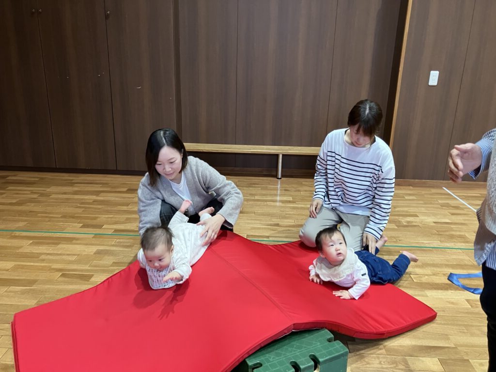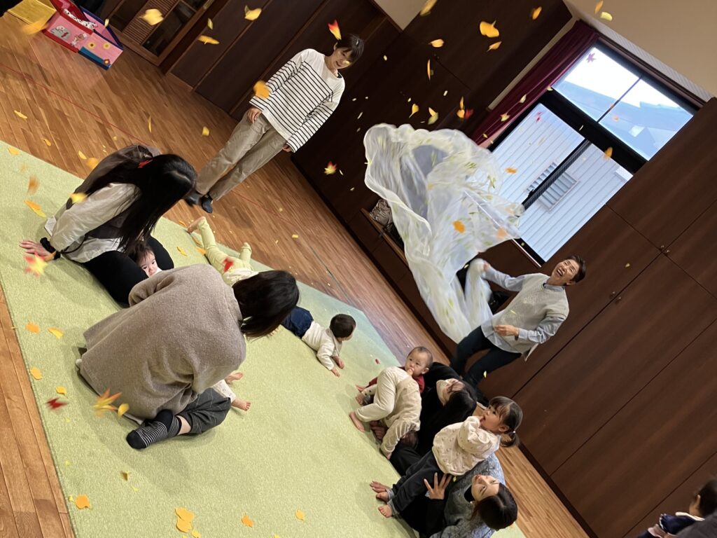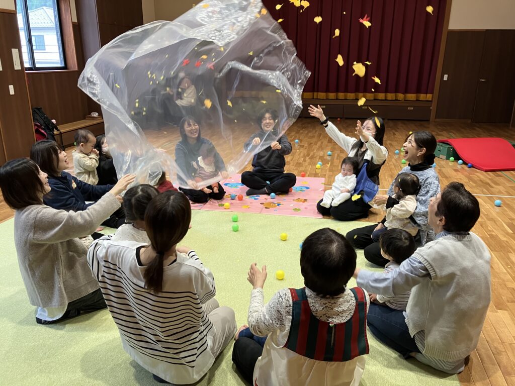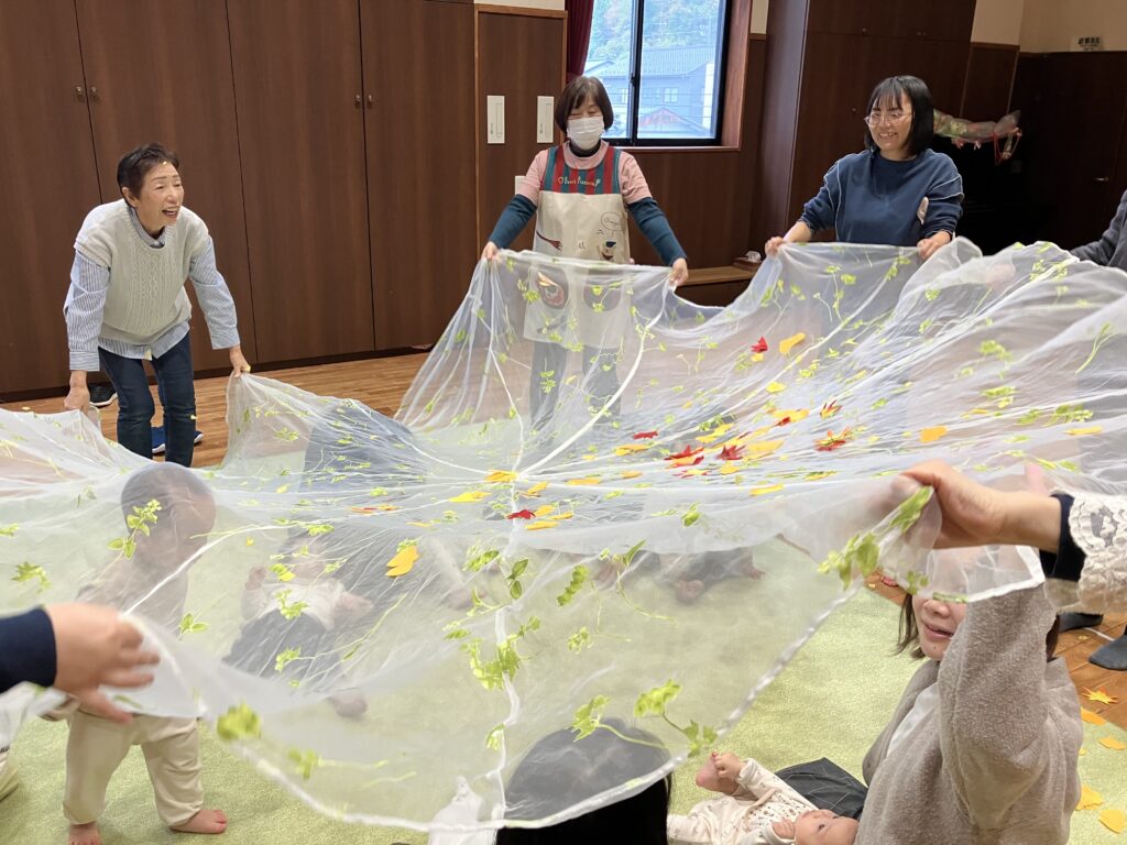 すくすくキッズ2025/11/13 親子ムーブメントあそびがありました🍂 今日は、片山先生による親子ムーブメントあそびがありました。今回のテーマは「秋のお山は楽しいよ!」でした。秋ならではの、どんぐりやまつぼっくり、落ち葉などをパラシュートにのせ、手をしっかり使って振りました。パラシュートに乗せるものによって重さや落ち方が違い、参加してくれた親子の方も楽しんでくれました。お子さんのいい笑顔がたくさん見られましたよ。